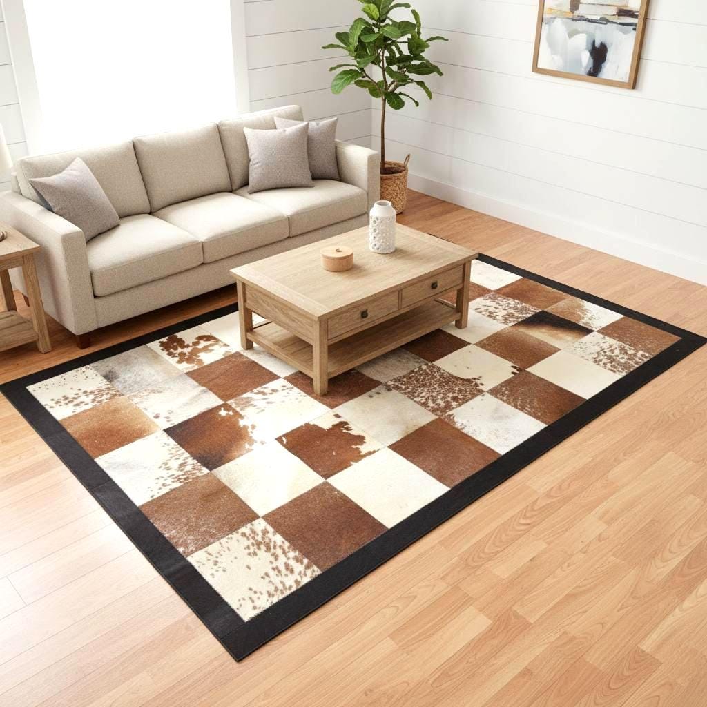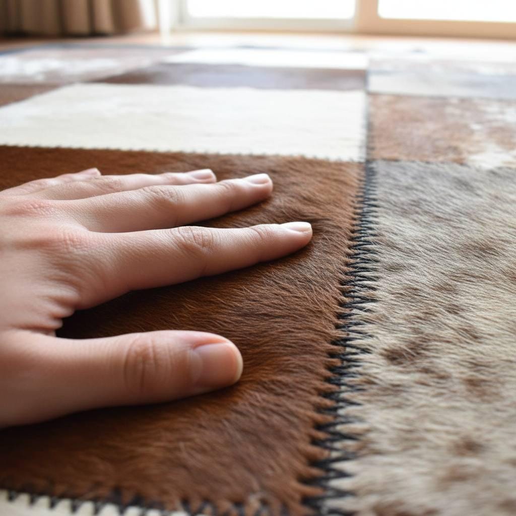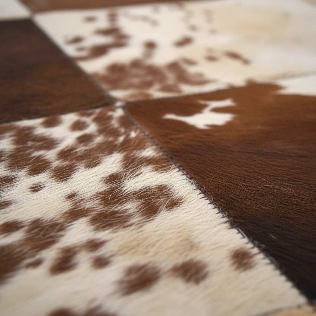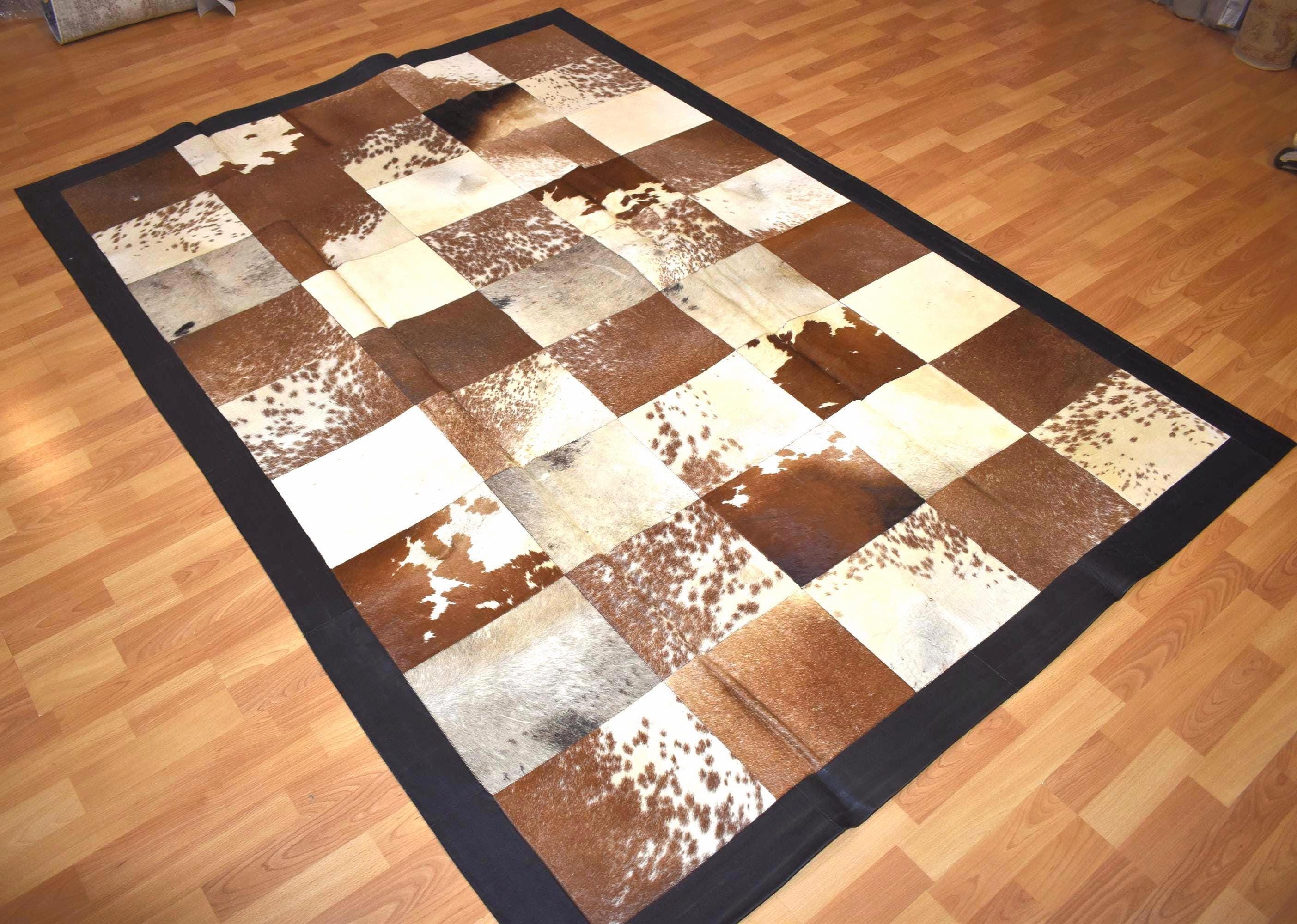 Each square panel is carefully stitched by hand, highlighting the natural beauty and variation of real cowhide. Because genuine leather hides are unique, every rug displays subtle differences in pattern and texture, making each piece special.