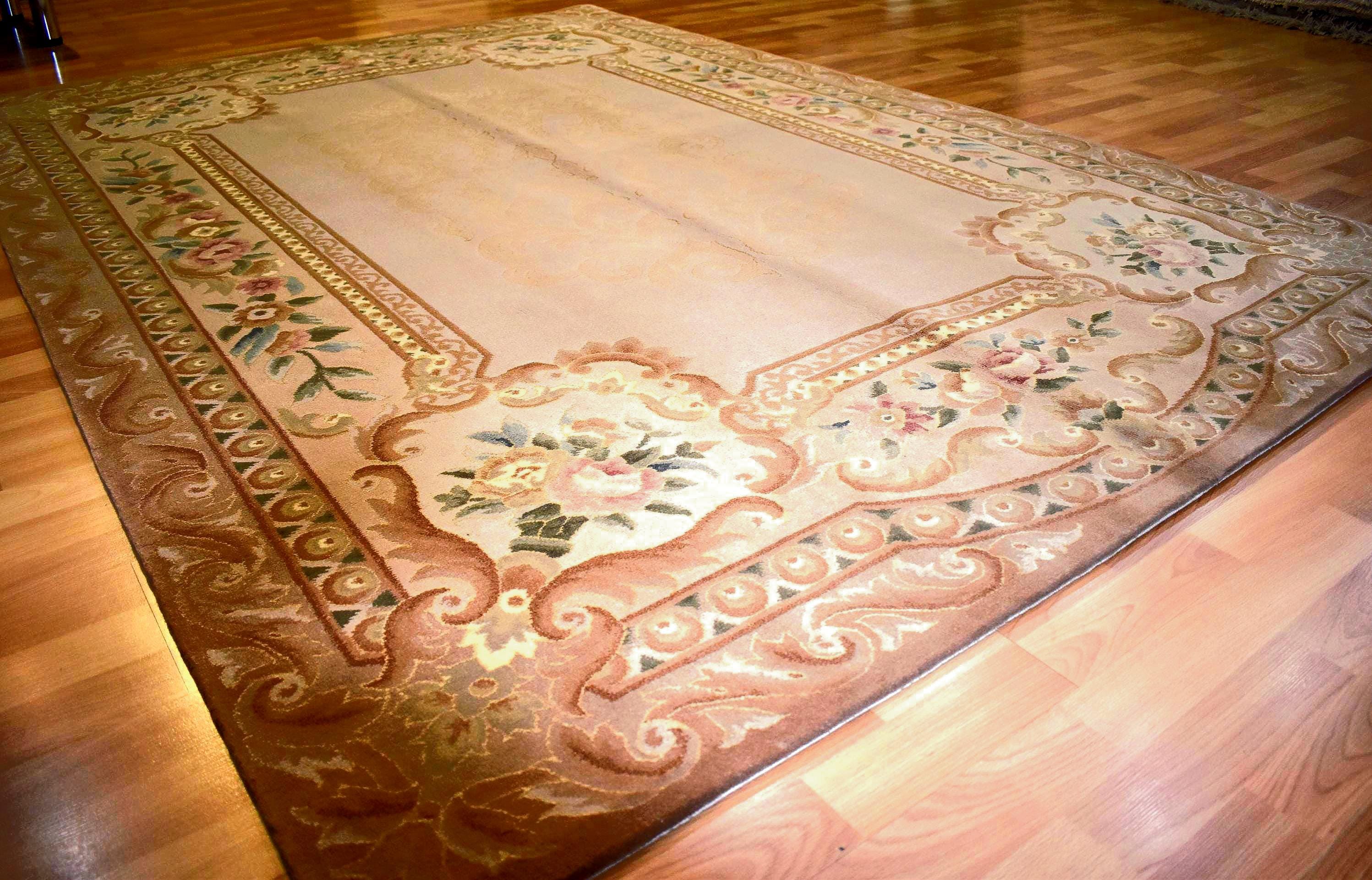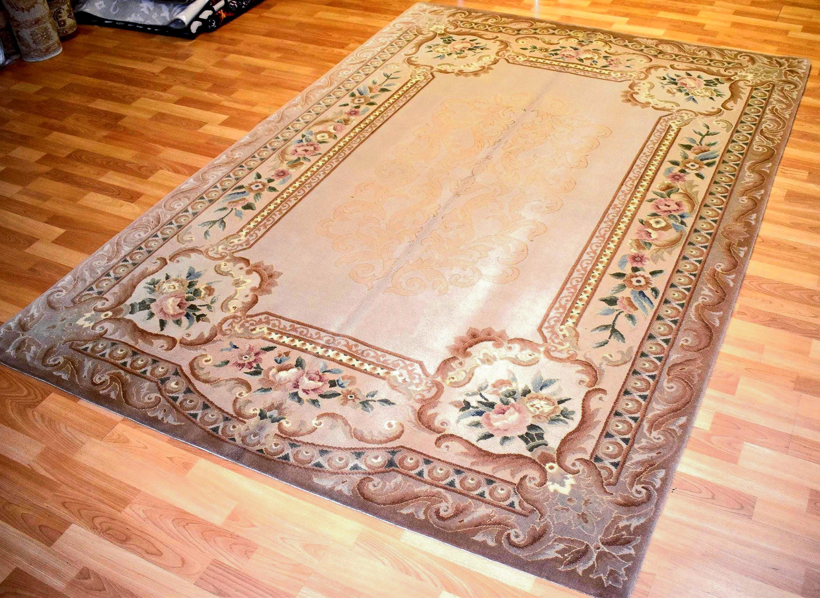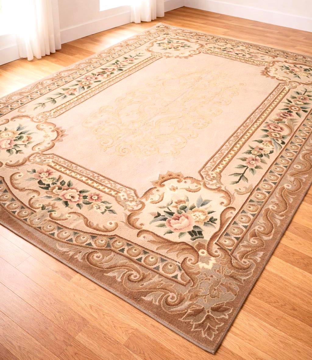 Bring timeless elegance into your home with this handwoven Chinese wool area rug, featuring a sophisticated European floral pattern and classic oriental design. Crafted from high-quality wool, this rug showcases soft beige tones combined with warm brown borders and delicate floral motifs, creating a refined and luxurious atmosphere.