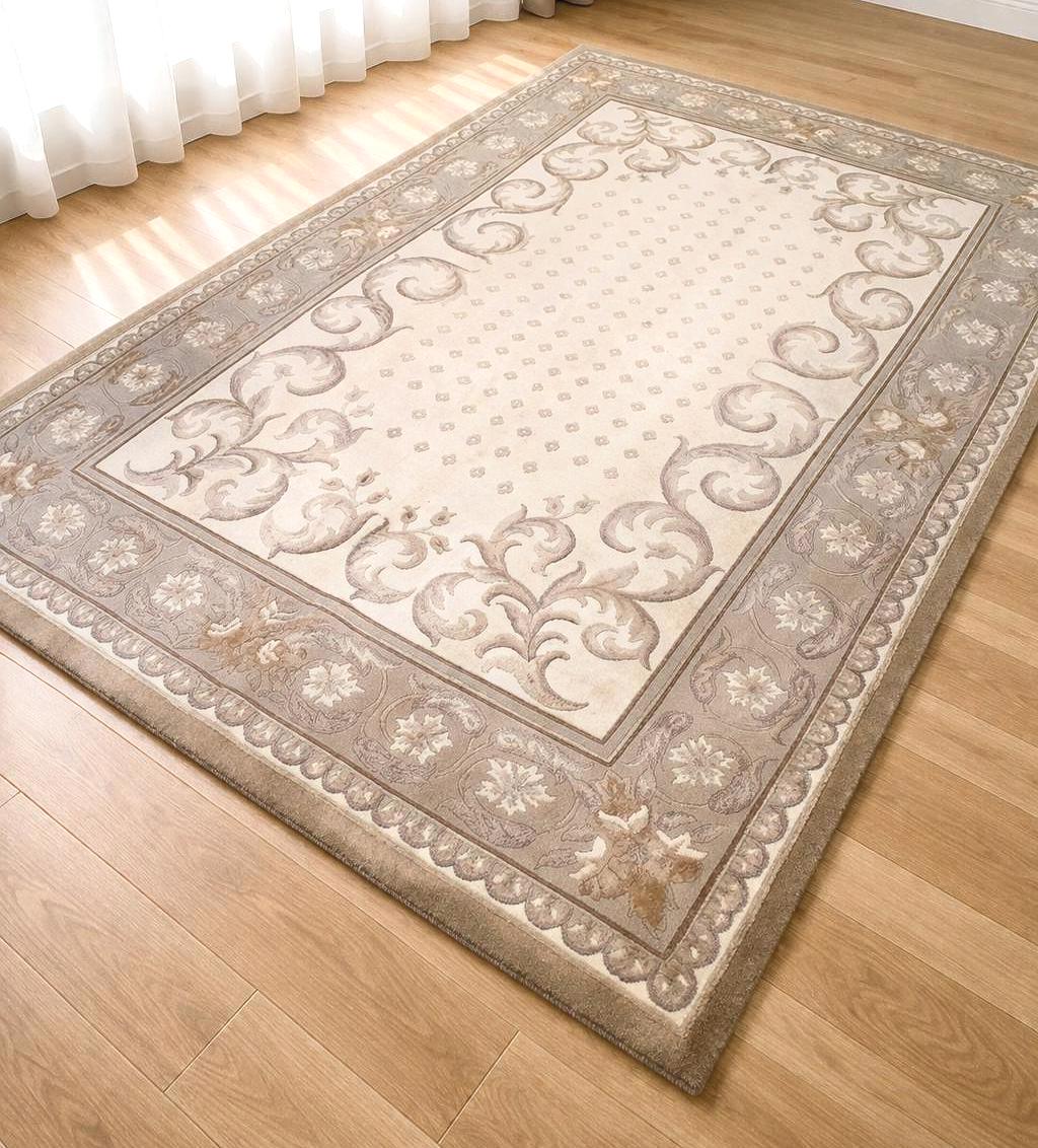 Handwoven Chinese Wool Area Rug – Classic Beige Oriental Elegance (5.57 x 7.87 ft)