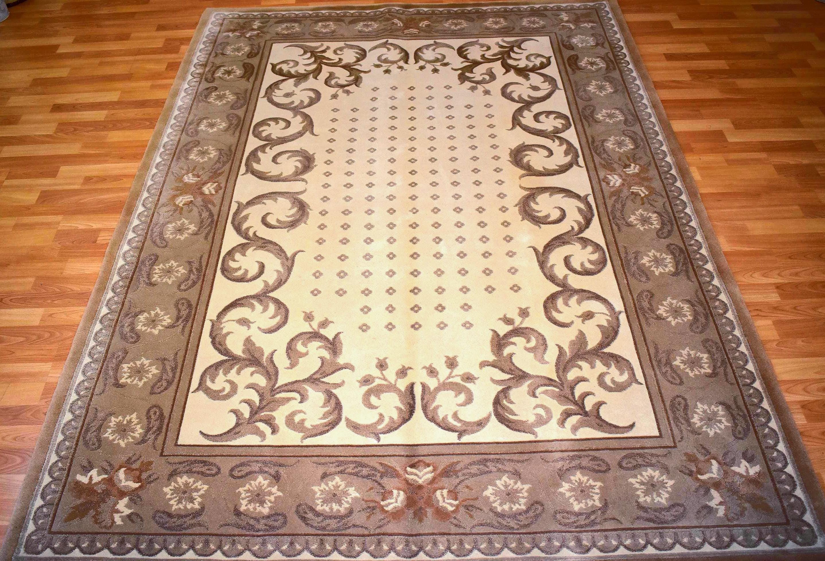 This handwoven Chinese wool area rug features an elegant traditional floral oriental design with soft beige tones and a decorative brown border. Crafted from high-quality wool, this rug offers durability, warmth, and a luxurious texture.
