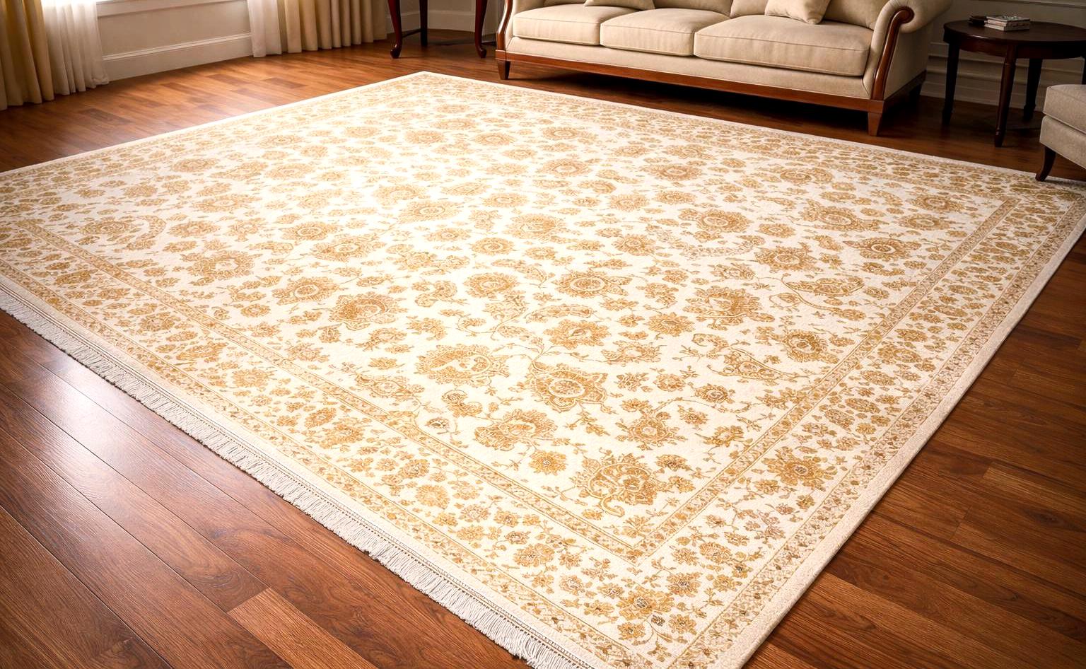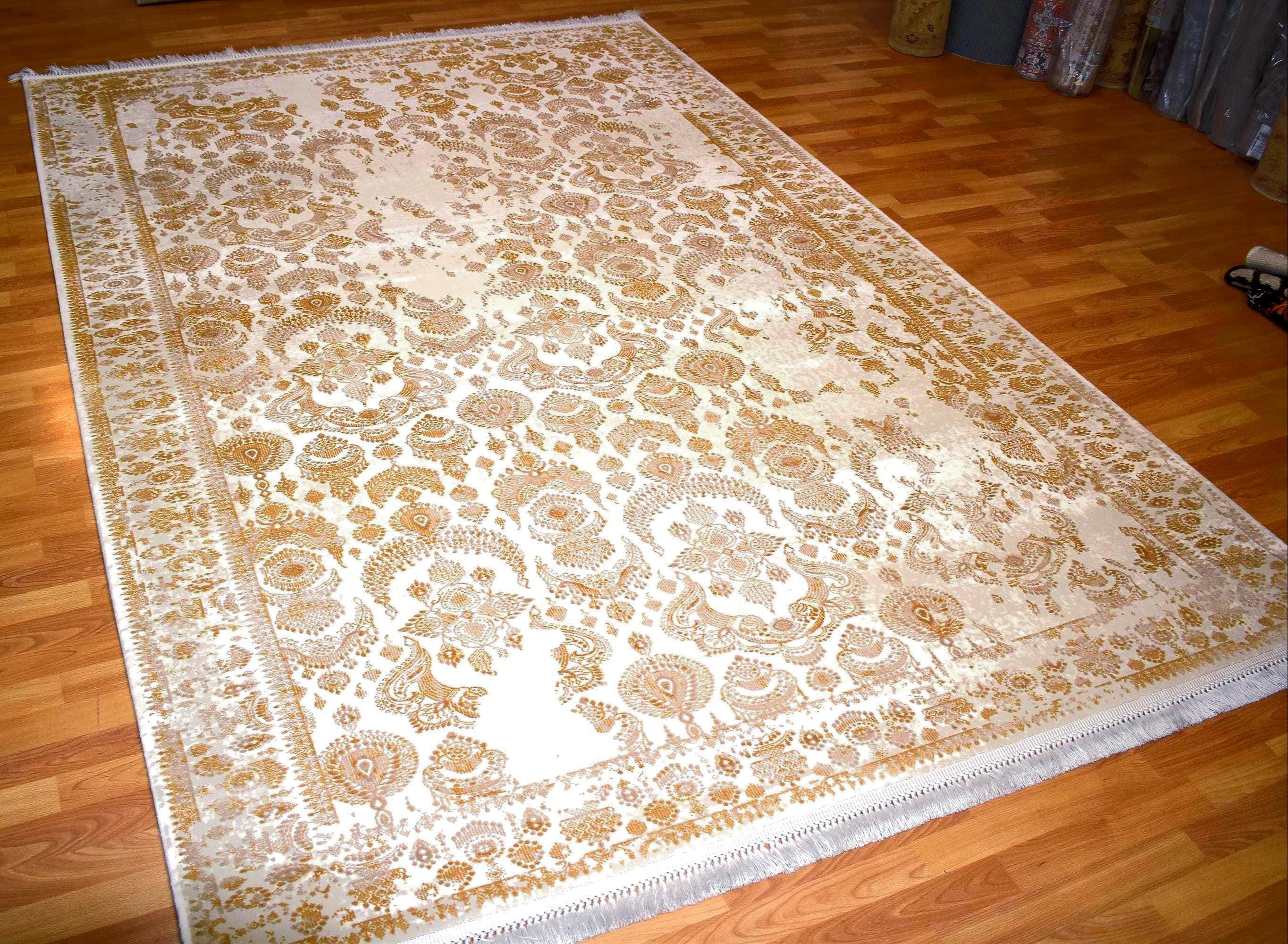 Elegant cream and gold oriental area rug featuring a delicate floral pattern inspired by traditional Turkish designs. Available in two sizes: 5.25 x 7.55 ft and 6.6 x 9.8 ft, making it suitable for different room layouts.