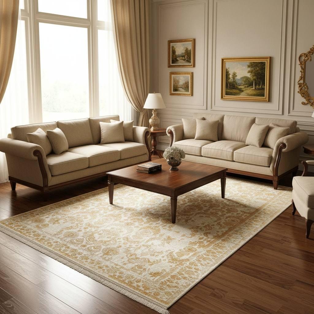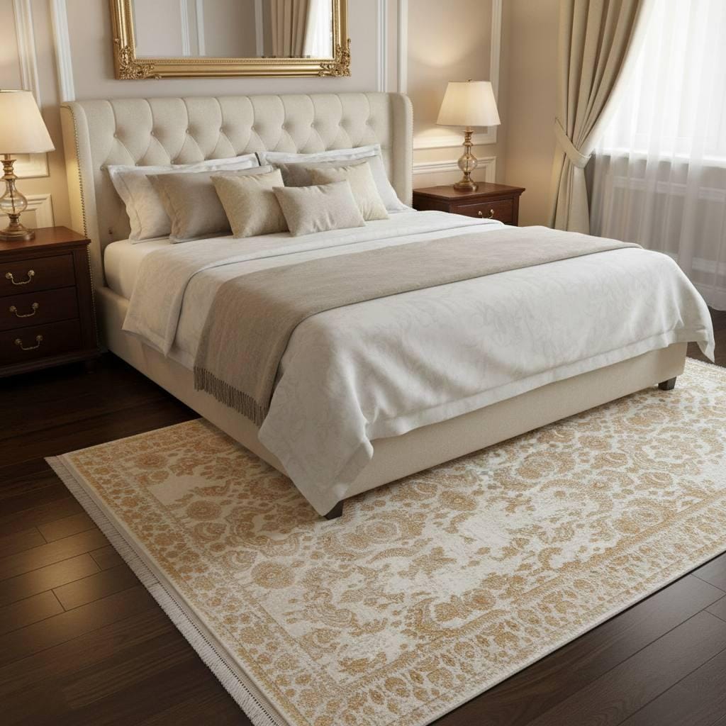 The refined cream and gold tones easily complement wooden floors and neutral furniture, making this rug a versatile centerpiece for classic and elegant interiors.