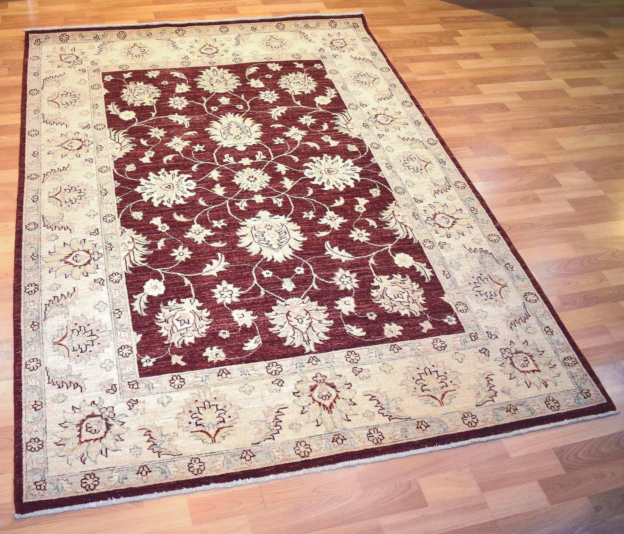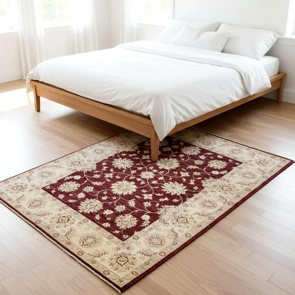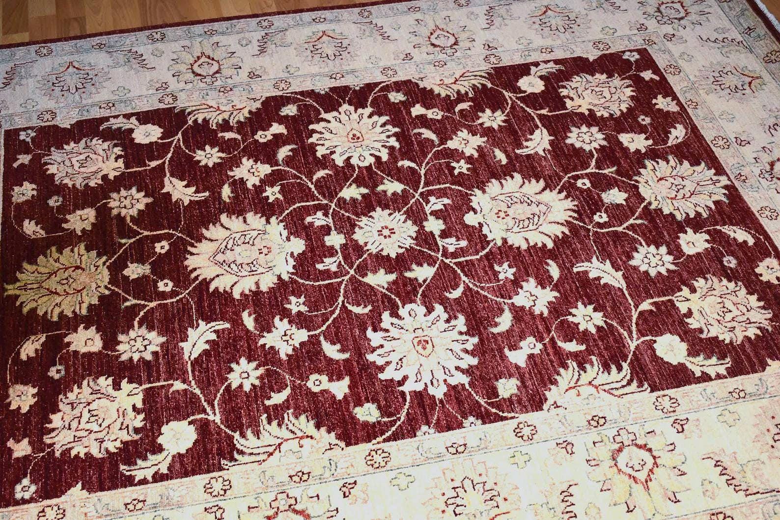 This one of a kind handwoven Afghan wool rug features a beautiful traditional oriental design with a rich red field and elegant ivory floral motifs. Carefully crafted by skilled artisans, this rug reflects the timeless beauty of tribal craftsmanship and authentic handwoven quality.