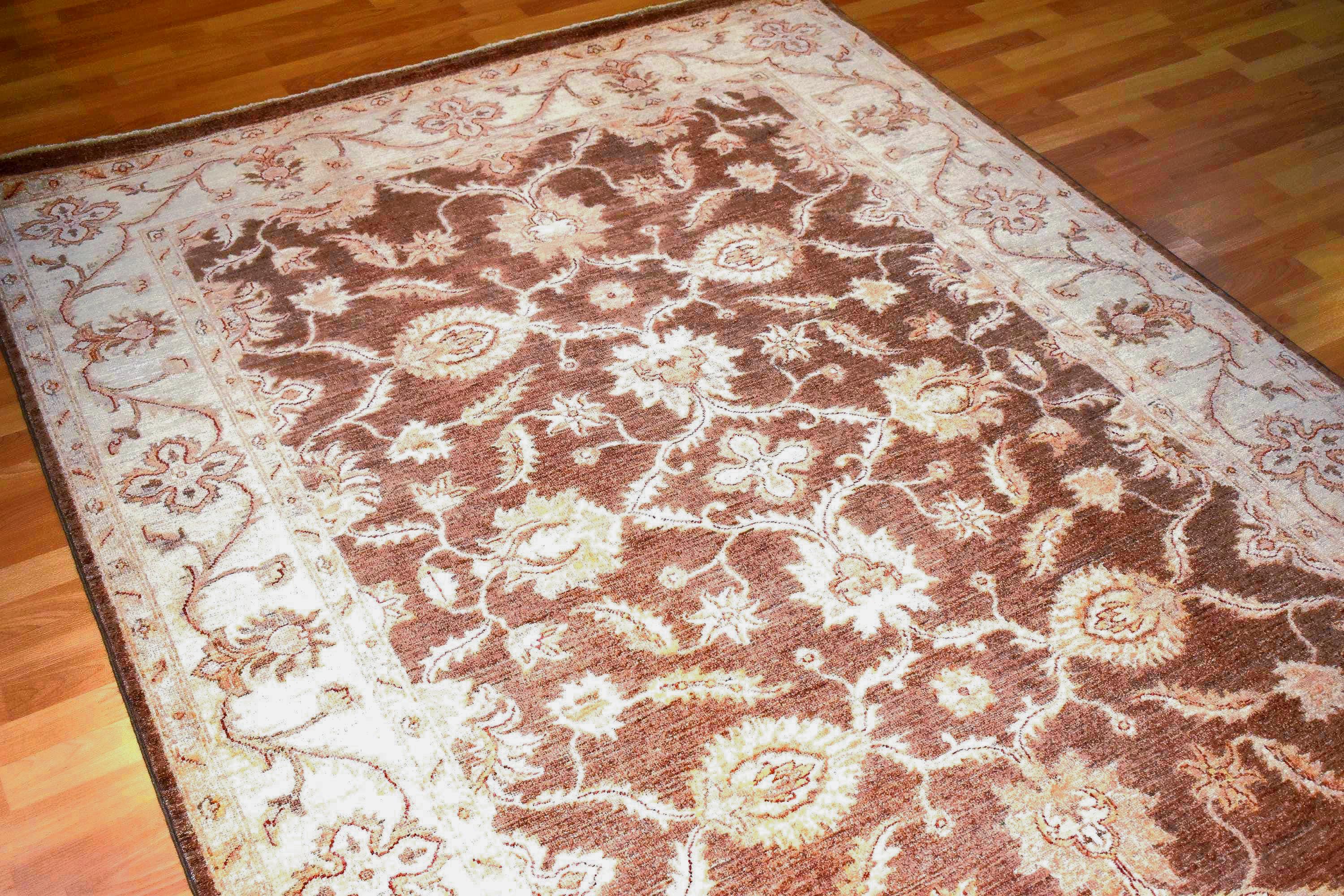 Bring timeless craftsmanship and authentic character into your home with this one of a kind handwoven Afghan wool rug. Carefully handmade by skilled artisans, this 8x6 ft traditional oriental rug features a warm brown field with elegant beige tribal floral motifs and decorative borders, creating a rich and inviting centerpiece for any interior.