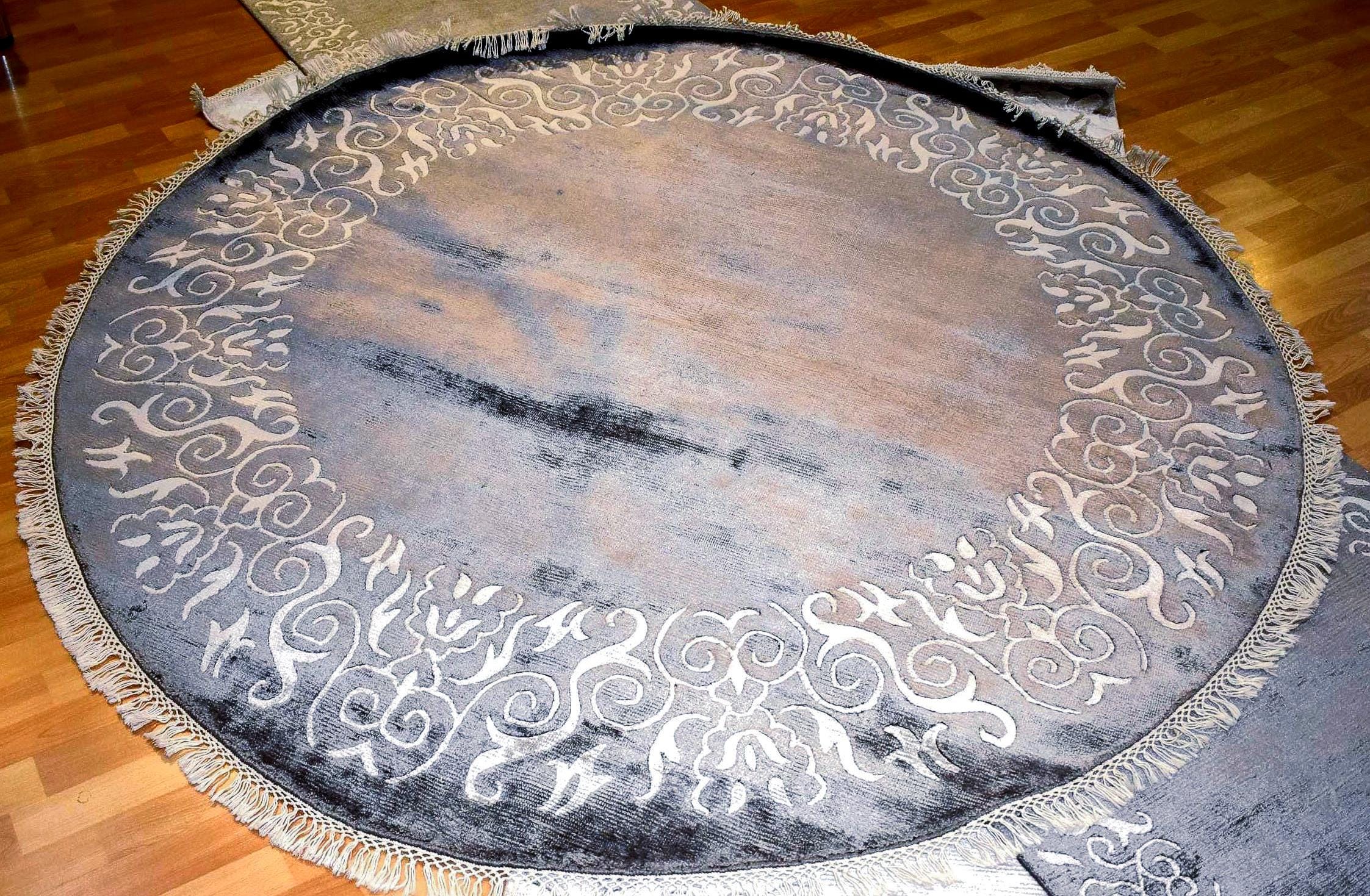 This luxury artisan round rug blends traditional craftsmanship with modern neutral colors, making it a timeless accent for elegant homes.