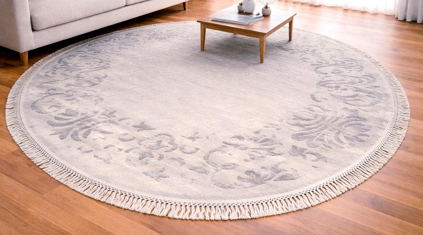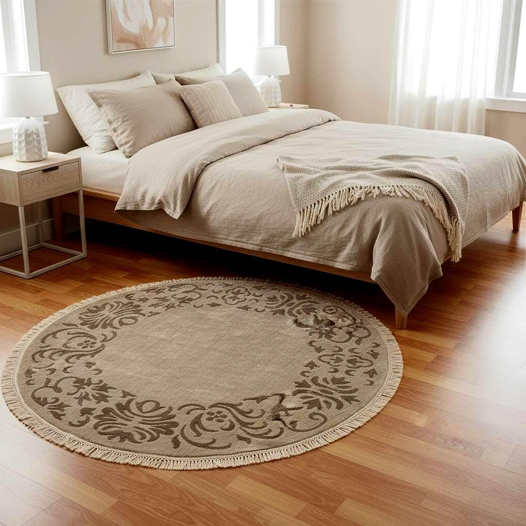 This handwoven Indian cotton round rug features elegant beige and gray tones with traditional ornamental borders, creating a refined and timeless centerpiece for any room. Carefully crafted by artisans, this luxury round area rug brings warmth, texture, and unique character to living rooms, bedrooms, and stylish interiors. Because it is handwoven, this rug is a One of a Kind (OOAK) piece that cannot be replicated.