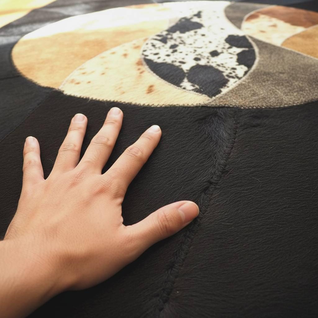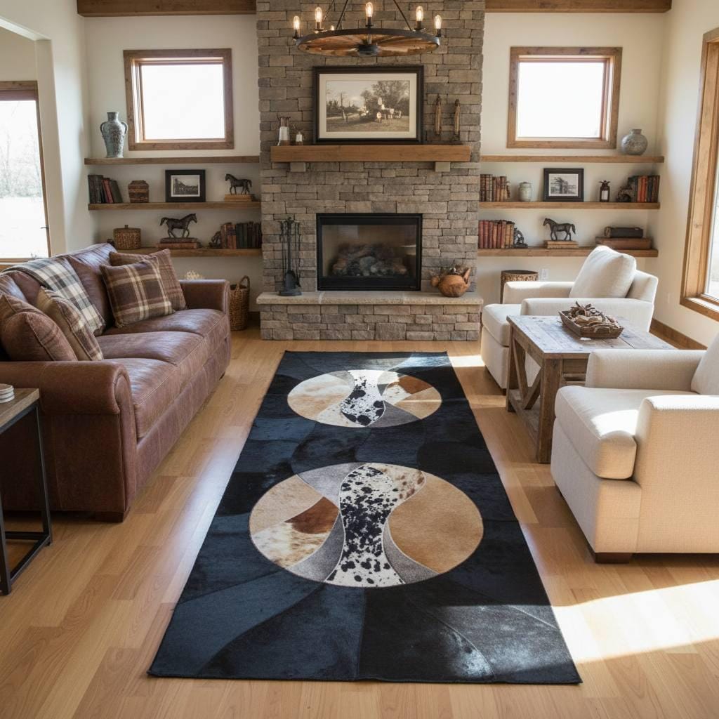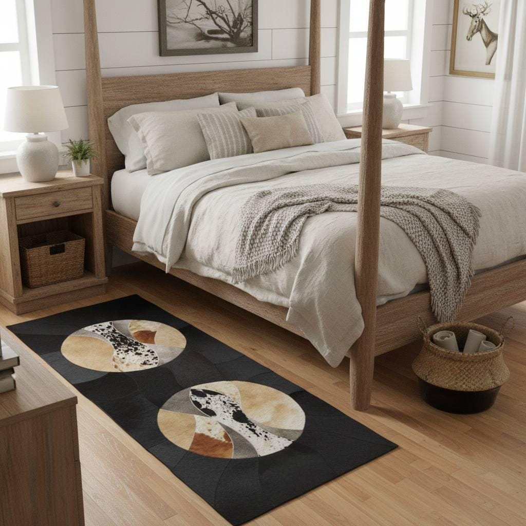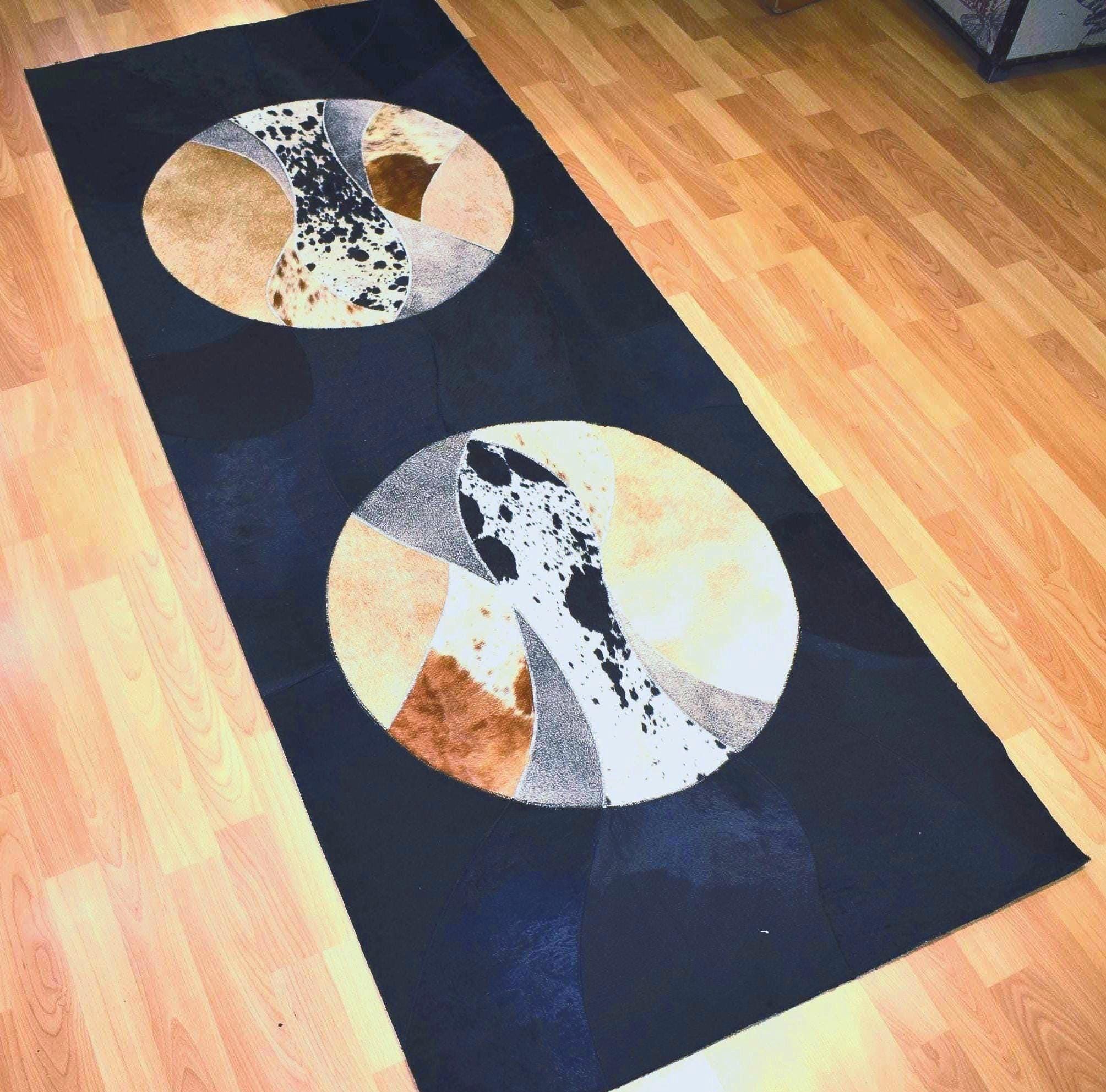 This handmade cowhide patchwork runner rug features a striking black leather base with geometric circular cowhide patterns, creating a bold statement piece for modern, rustic, and western-inspired interiors. Carefully crafted from genuine cowhide leather, this modern hallway runner rug combines durability, texture, and artistic design for stylish homes.