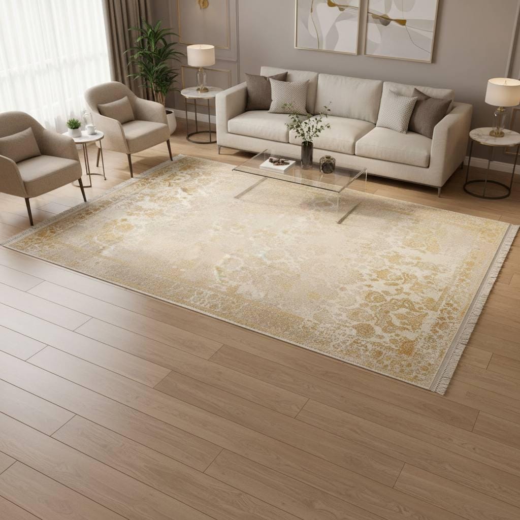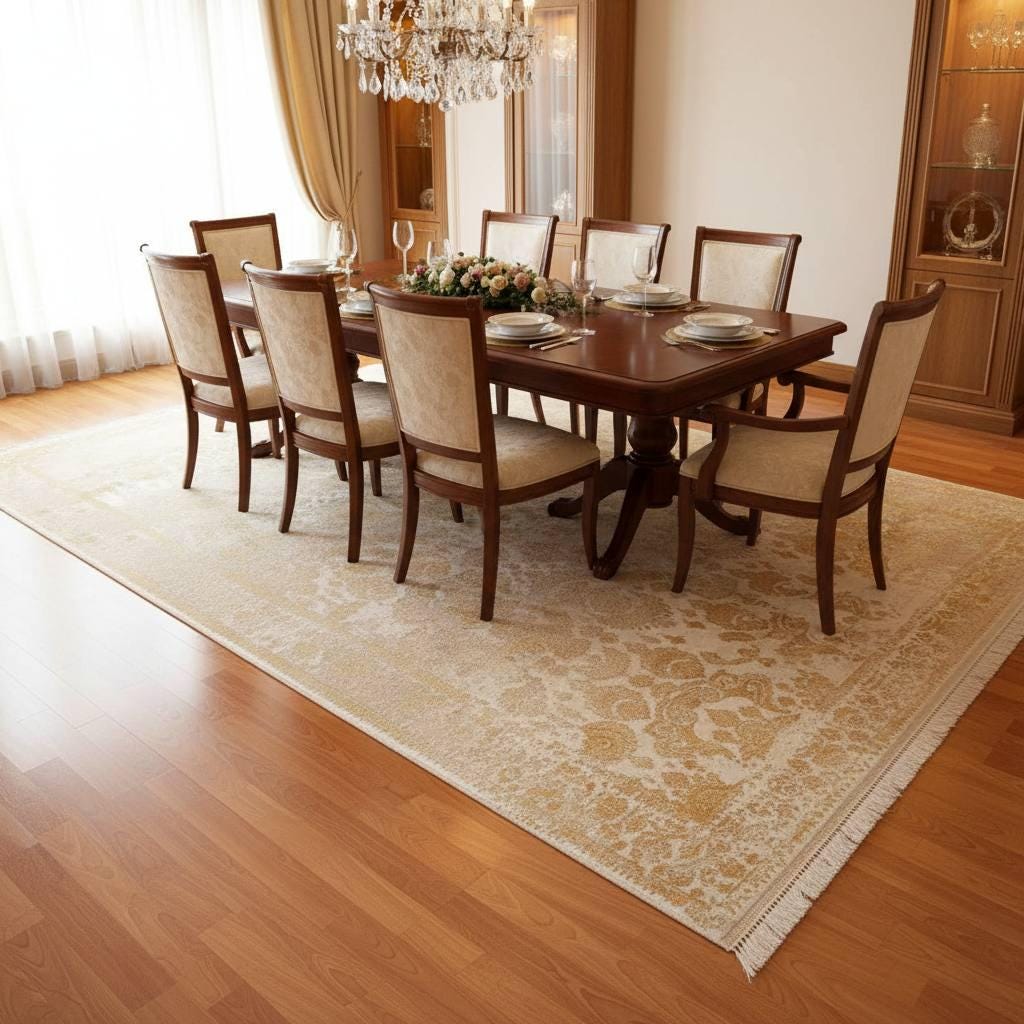 This rug blends traditional craftsmanship aesthetics with durable modern materials, offering both visual richness and everyday practicality.