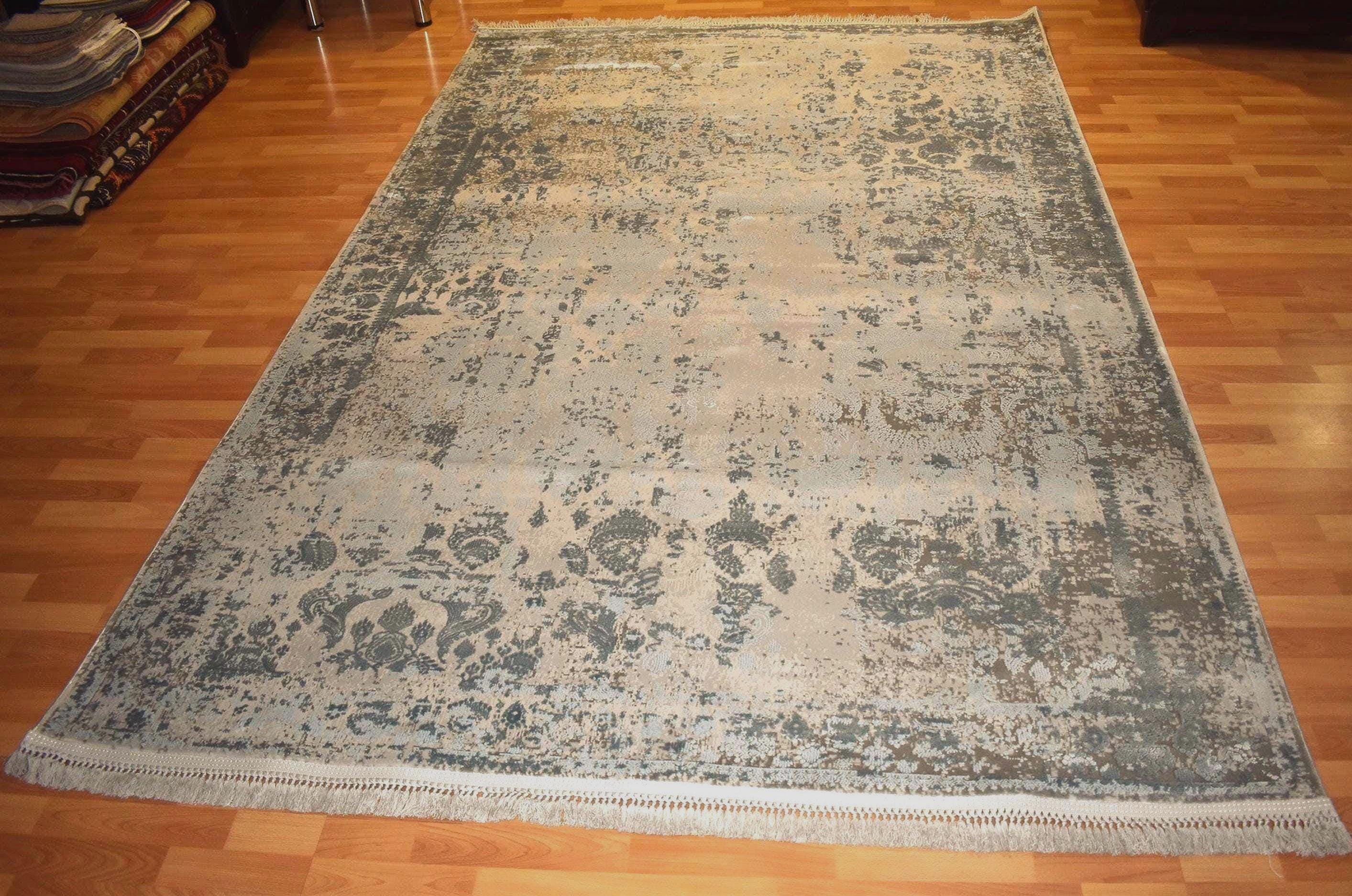 Large Turkish Gold Blue Area Rug 6.5x9.8 Ft Traditional Persian Style Carpet Vintage Oriental Living Room Rug Luxury Neutral Home Decor