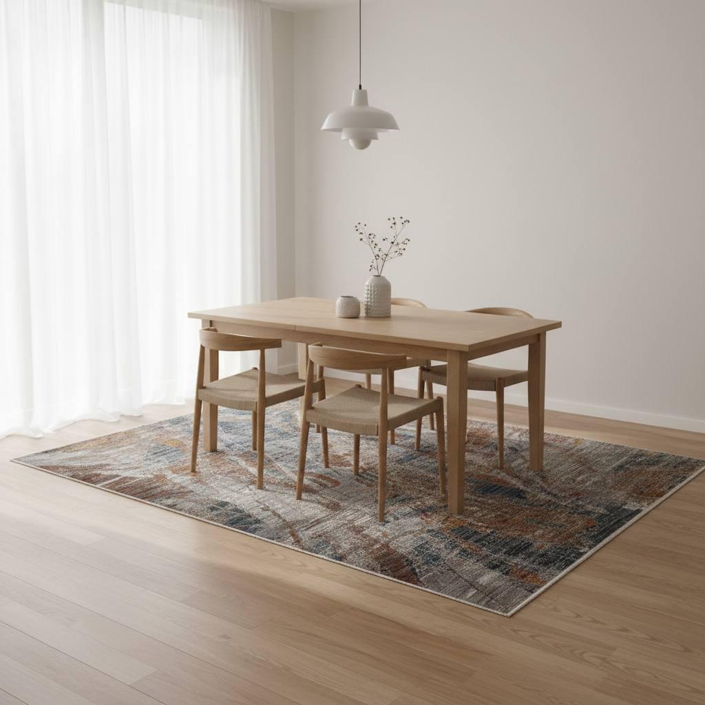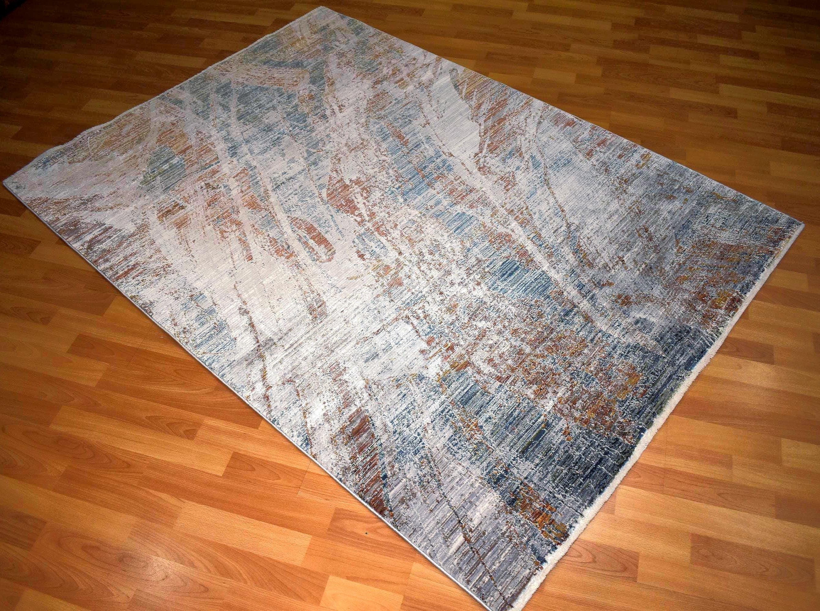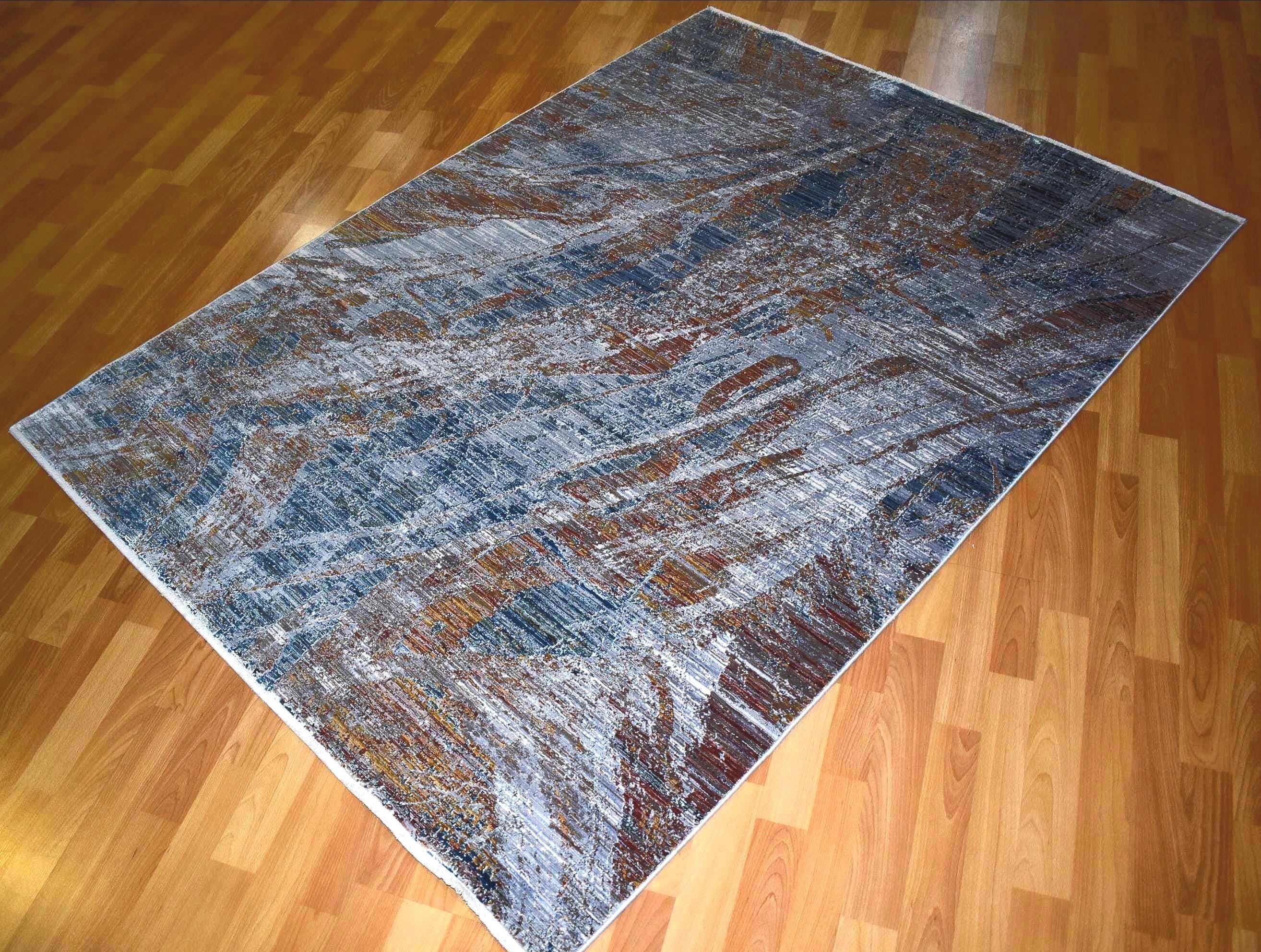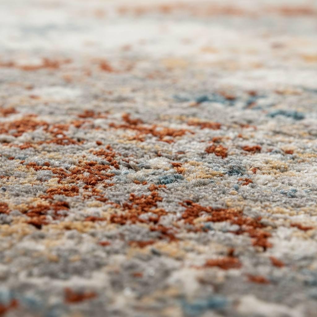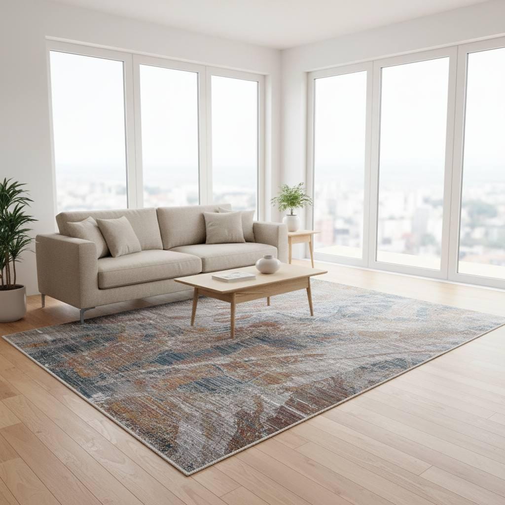 Add a modern artistic touch to your home with this Turkish abstract area rug. Featuring a contemporary textured design in neutral tones of beige, grey, rust and blue, this rug blends perfectly with modern and minimalist interiors.