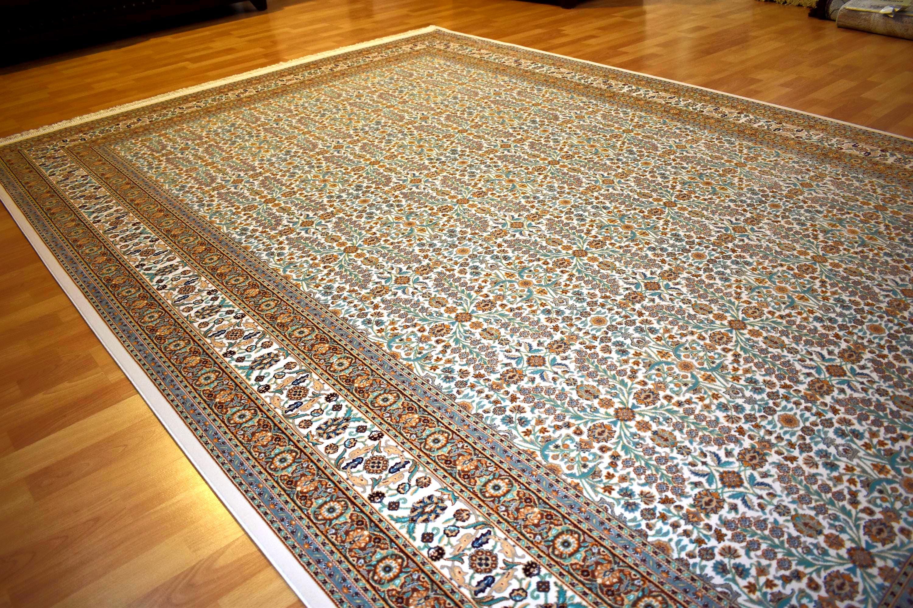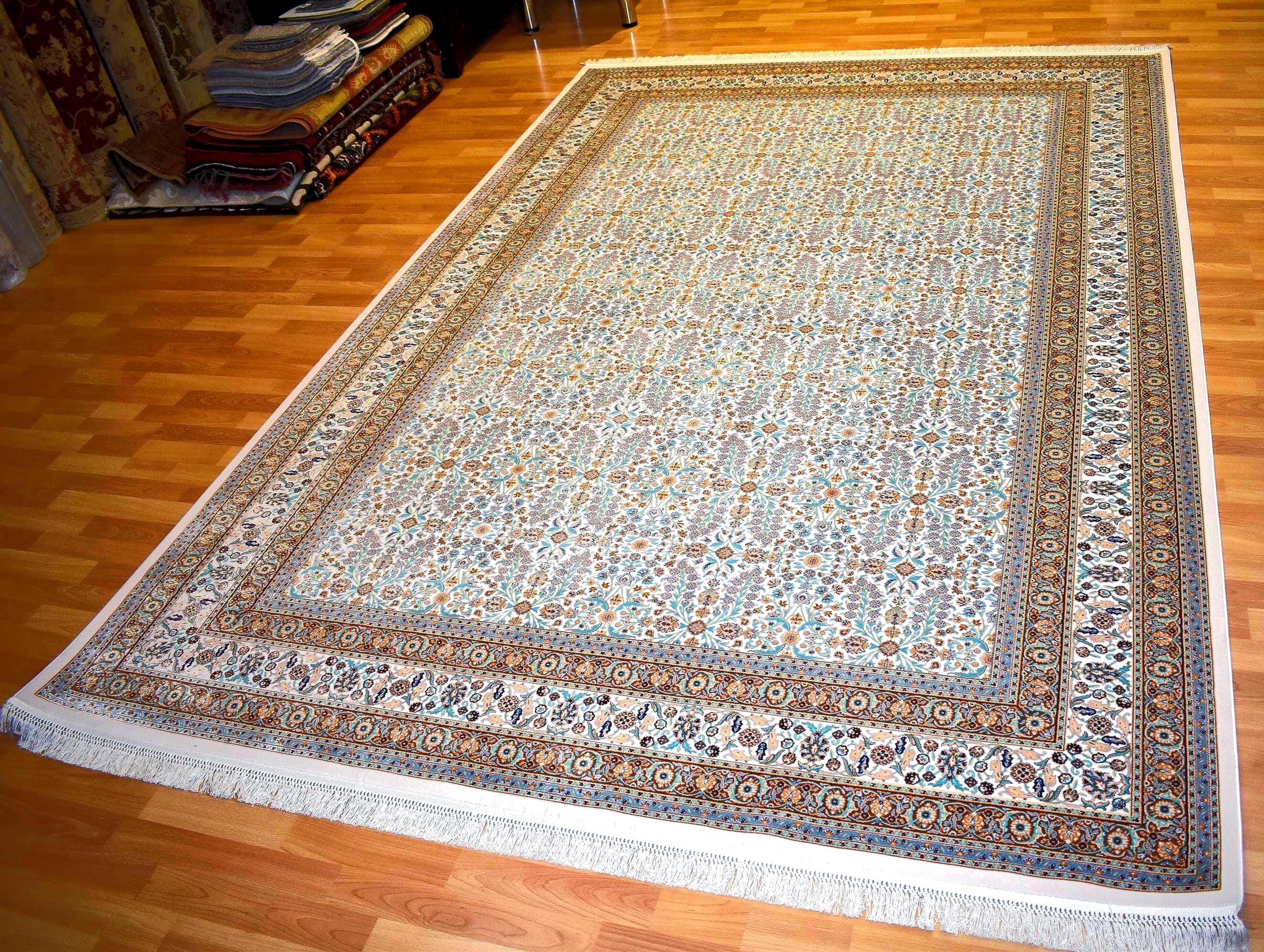 This large Turkish area rug features a beautiful modern traditional oriental design with intricate floral patterns and elegant cream, blue, and warm earth tones. Its timeless style brings sophistication and warmth to any interior, making it a perfect centerpiece for spacious living areas.