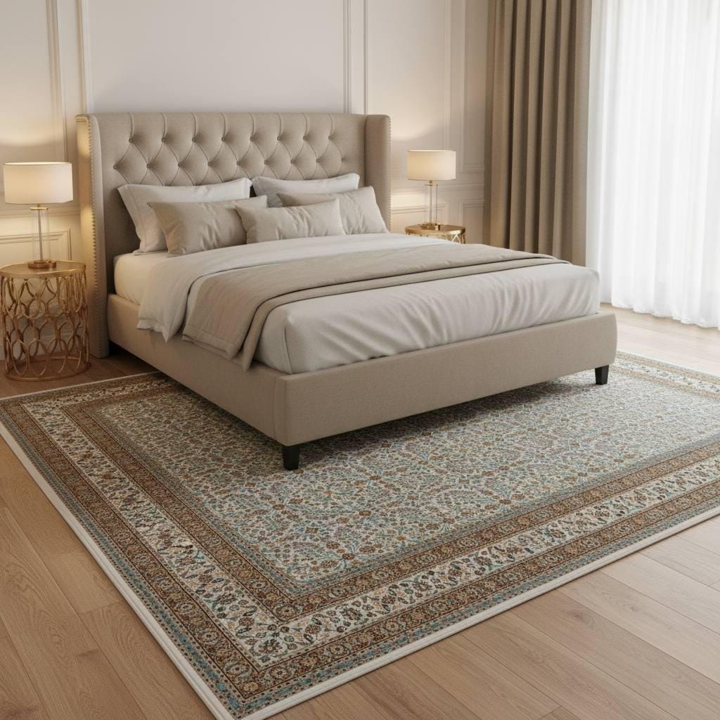 Its balanced cream background and intricate floral motifs allow it to complement both modern and classic furniture styles.