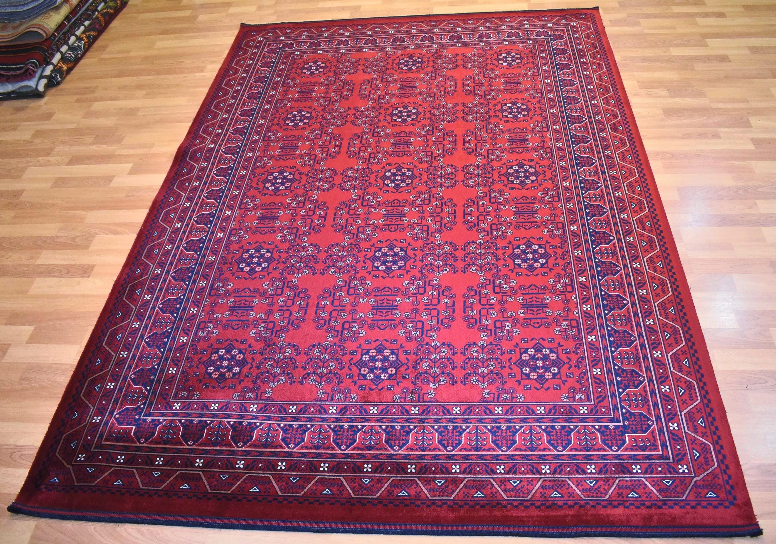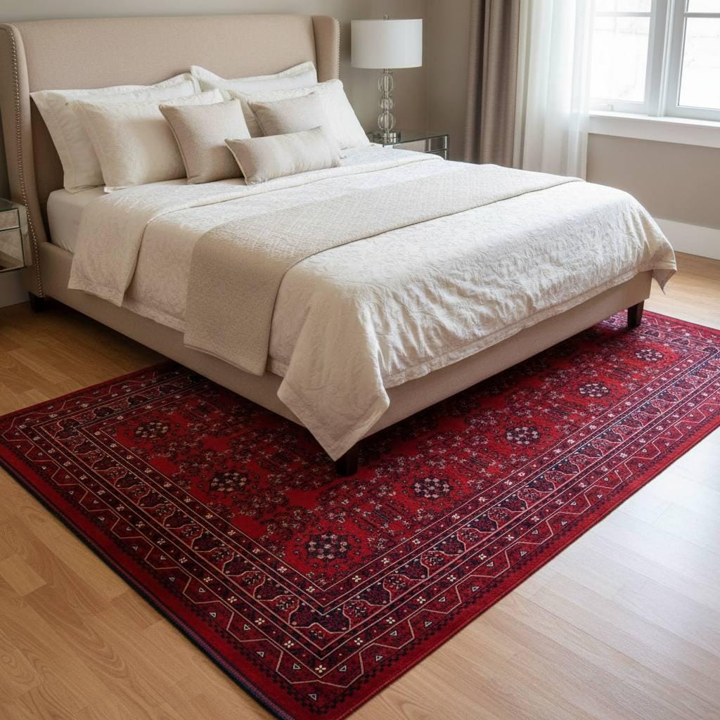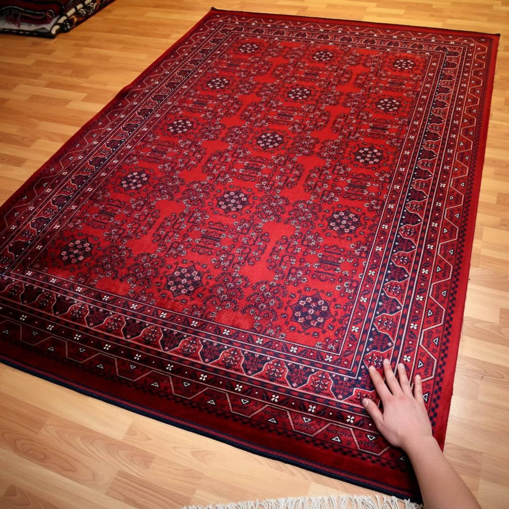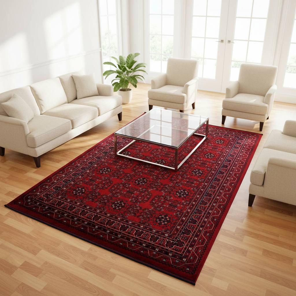 This red Afghan area rug showcases a timeless traditional oriental design with rich red tones and classic geometric motifs. Inspired by authentic Afghan carpets, this elegant rug brings warmth, depth, and character to any living space while serving as a striking decorative centerpiece.