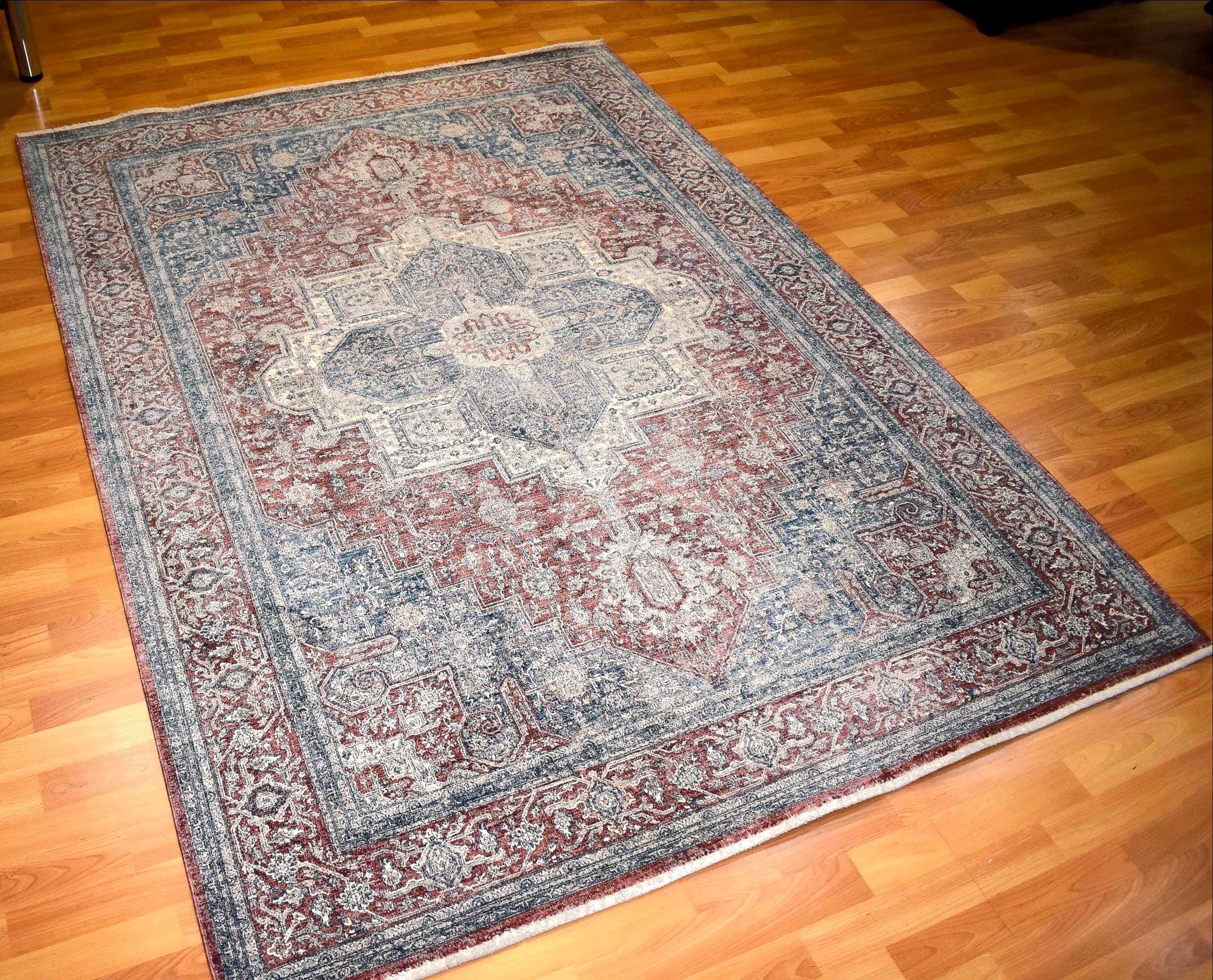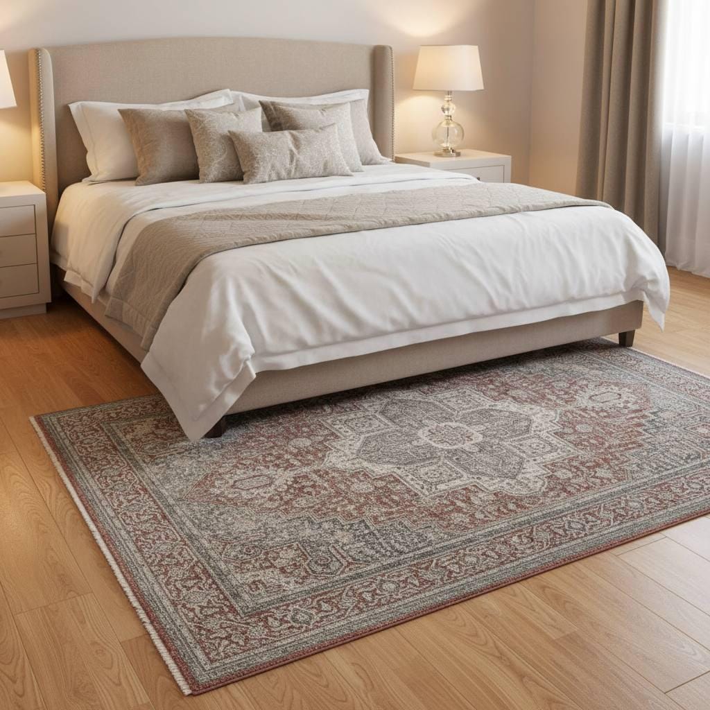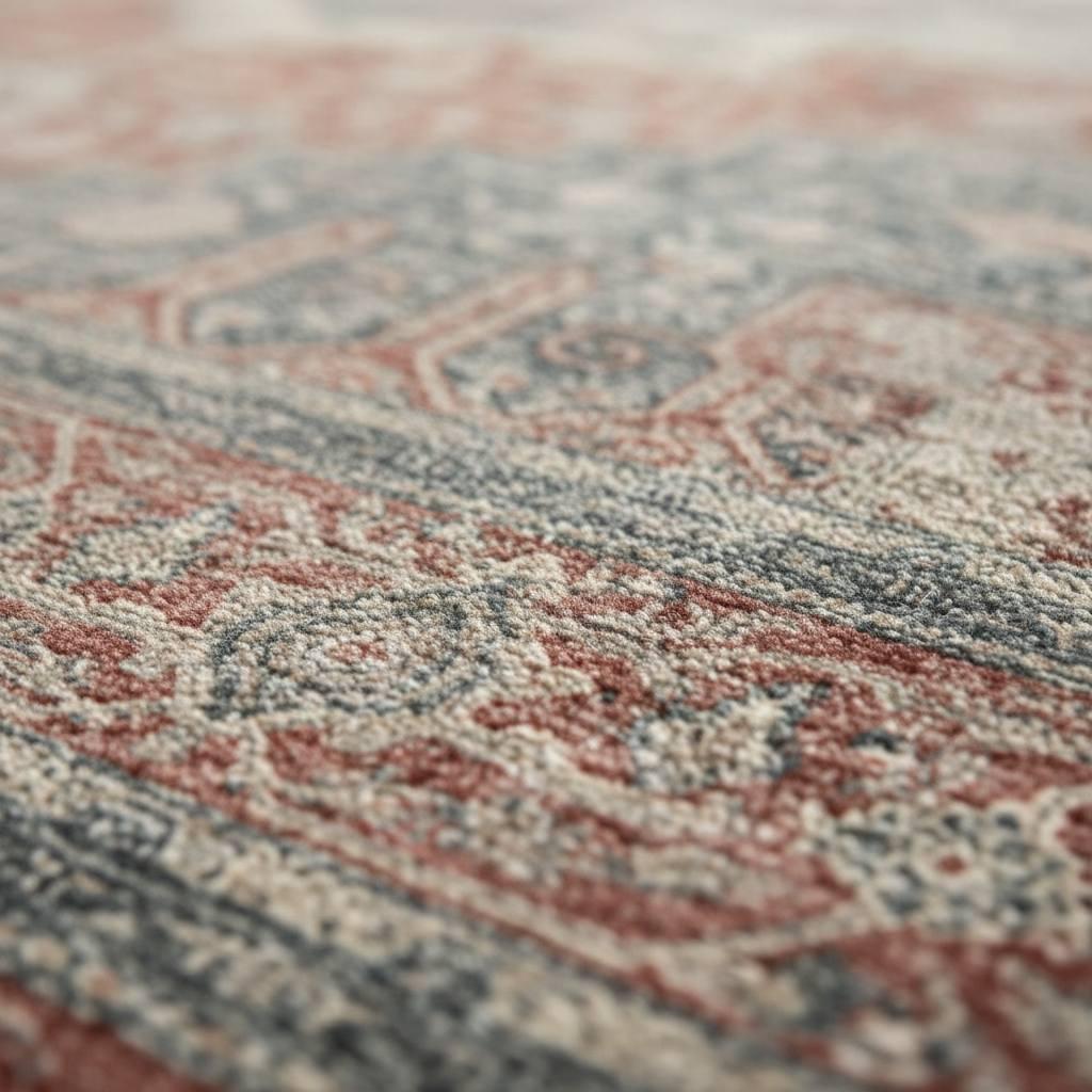 Its distressed red and gray palette adds warmth while blending easily with wood floors and natural textures.