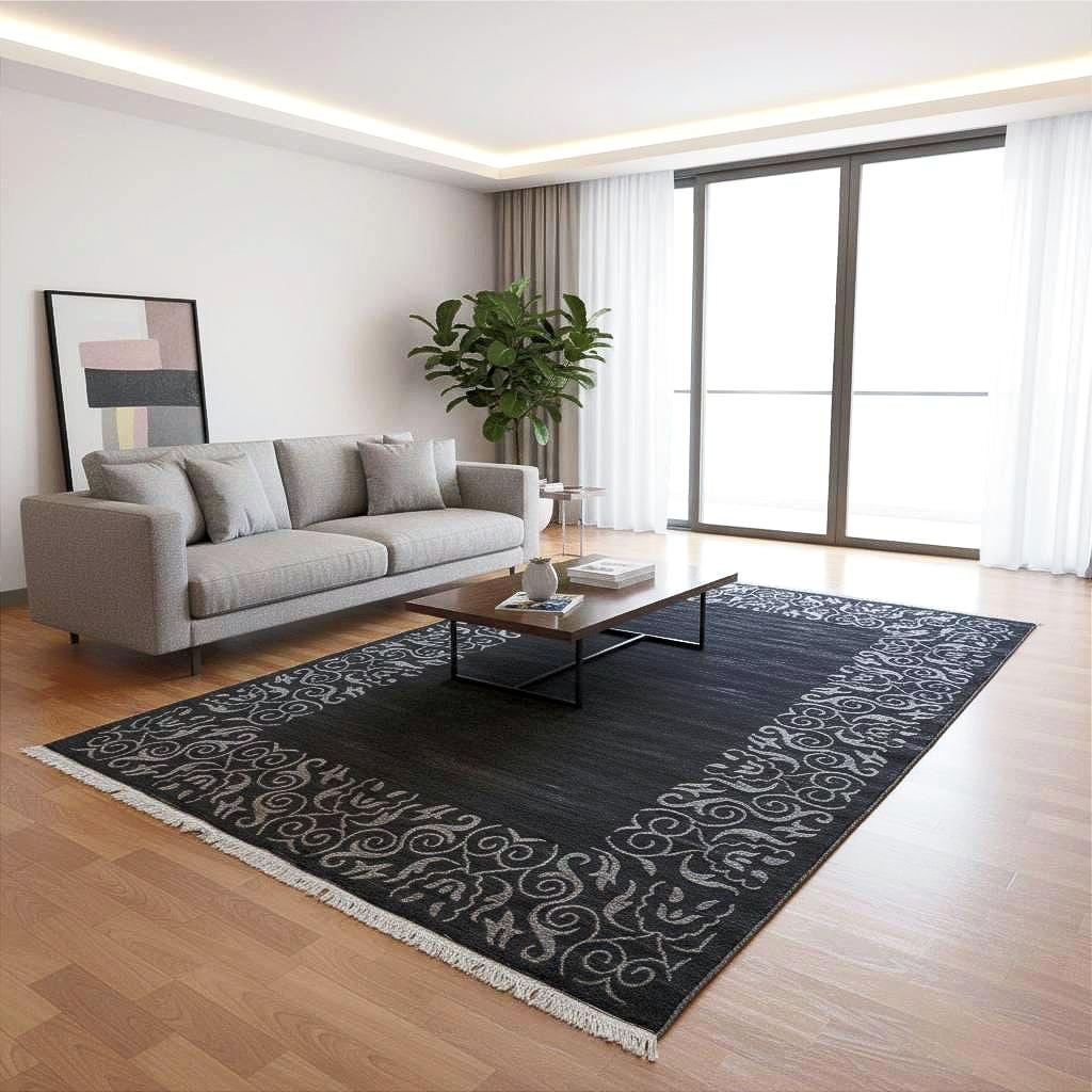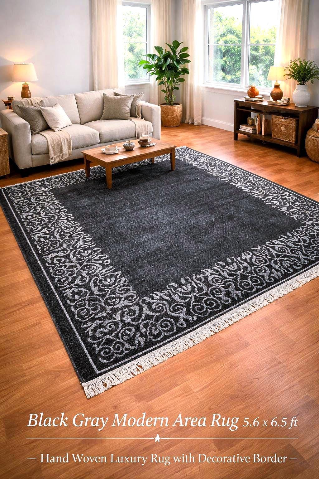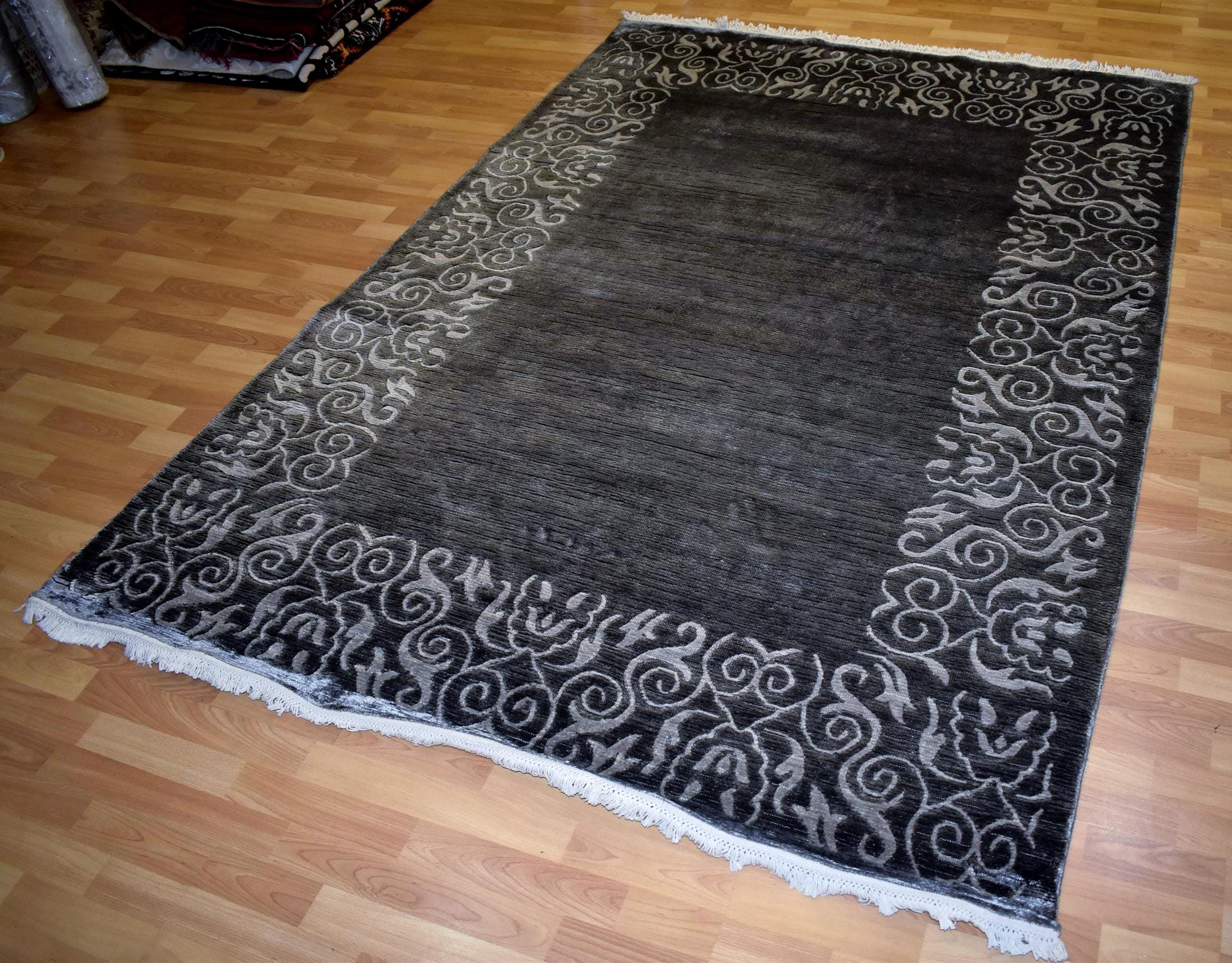 Black Gray Modern Area Rug Indian Hand Woven Rug Viscose Bamboo Silk Rug Luxury Living Room Rug Decorative Border Bedroom Rug