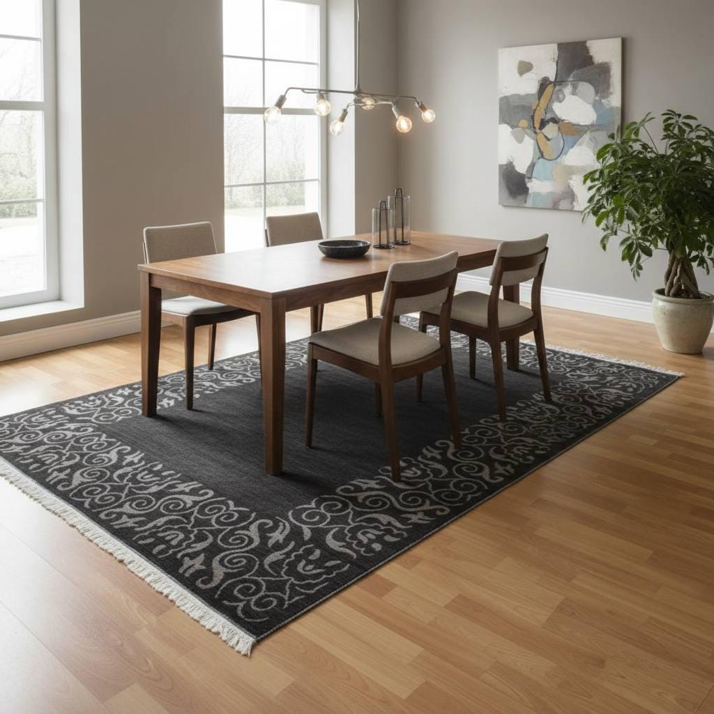 Bring elegance and texture to your home with this Indian hand woven modern area rug, crafted from luxurious viscose and bamboo silk fibers. Featuring a sophisticated black and gray color palette with decorative border patterns, this rug adds a refined and contemporary touch to living rooms, bedrooms, and stylish interiors.