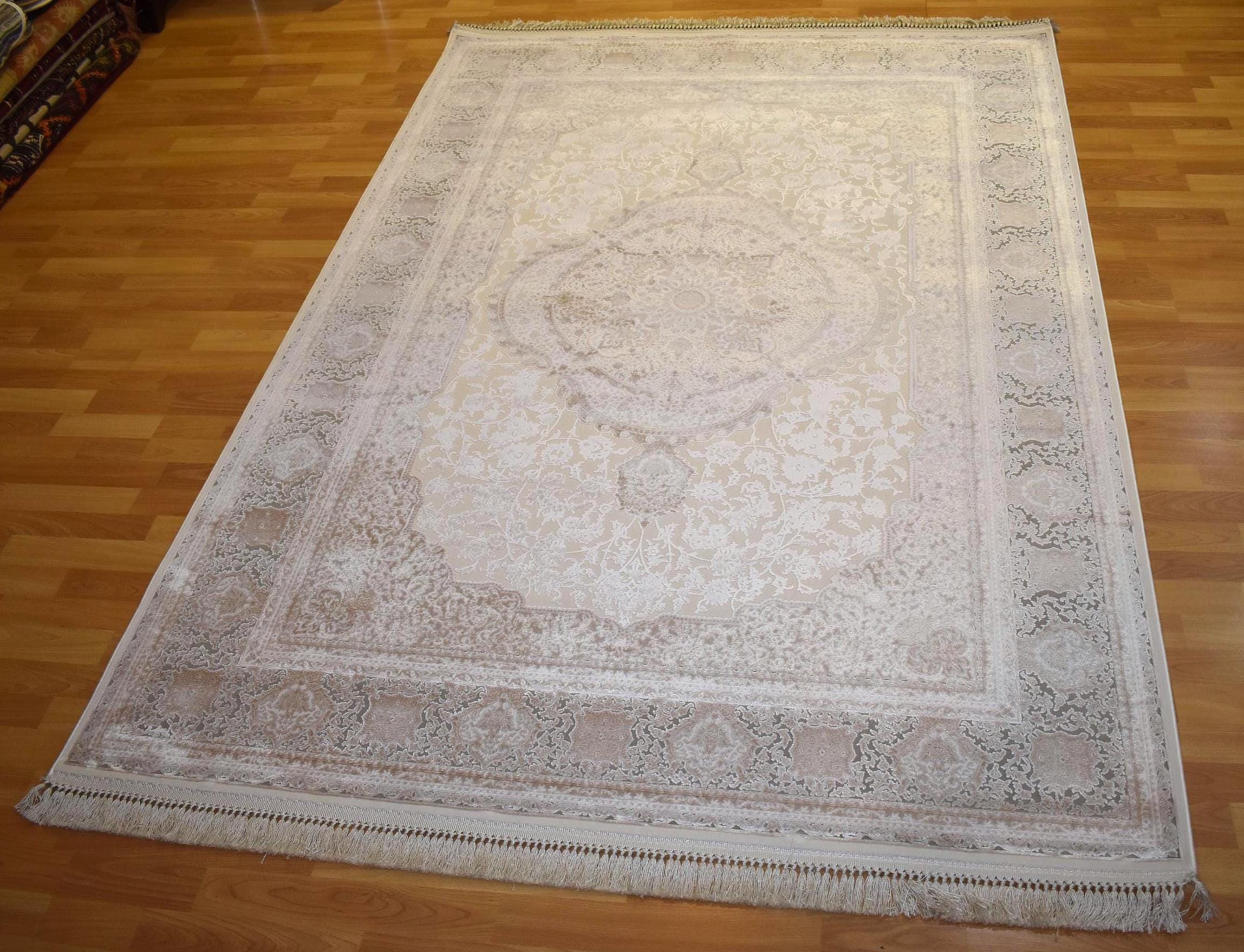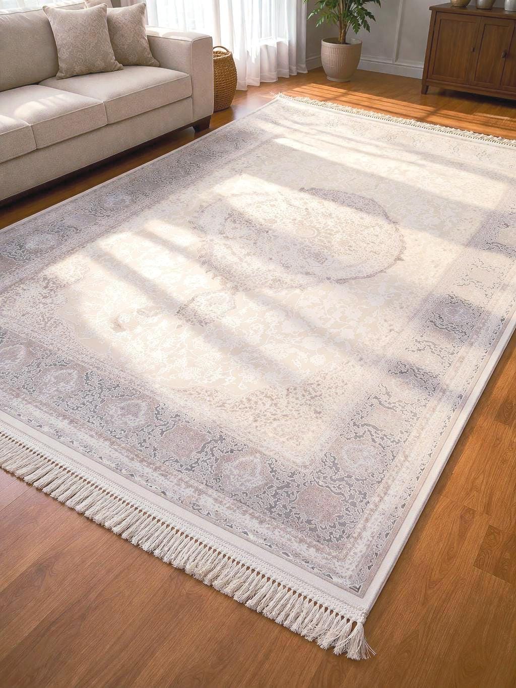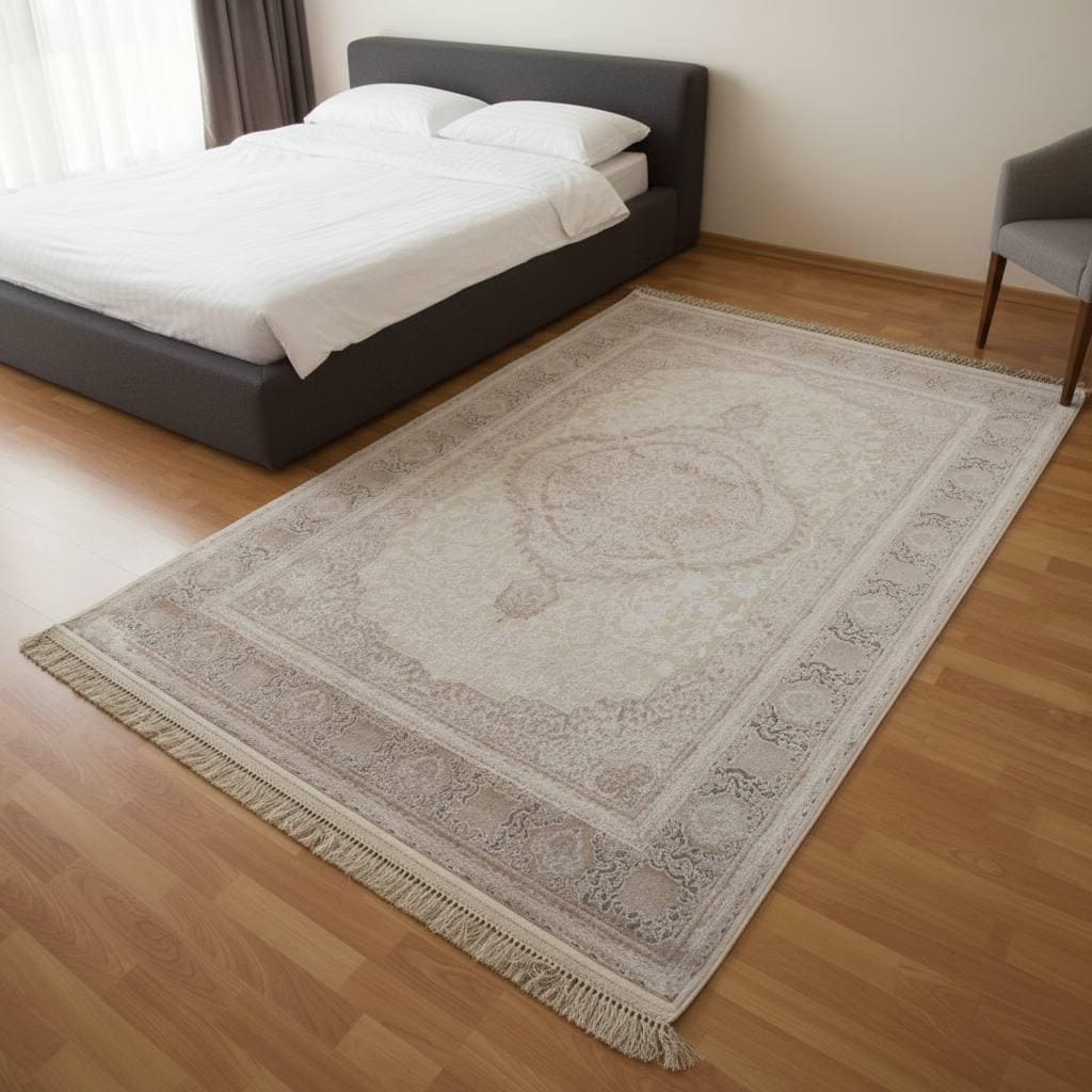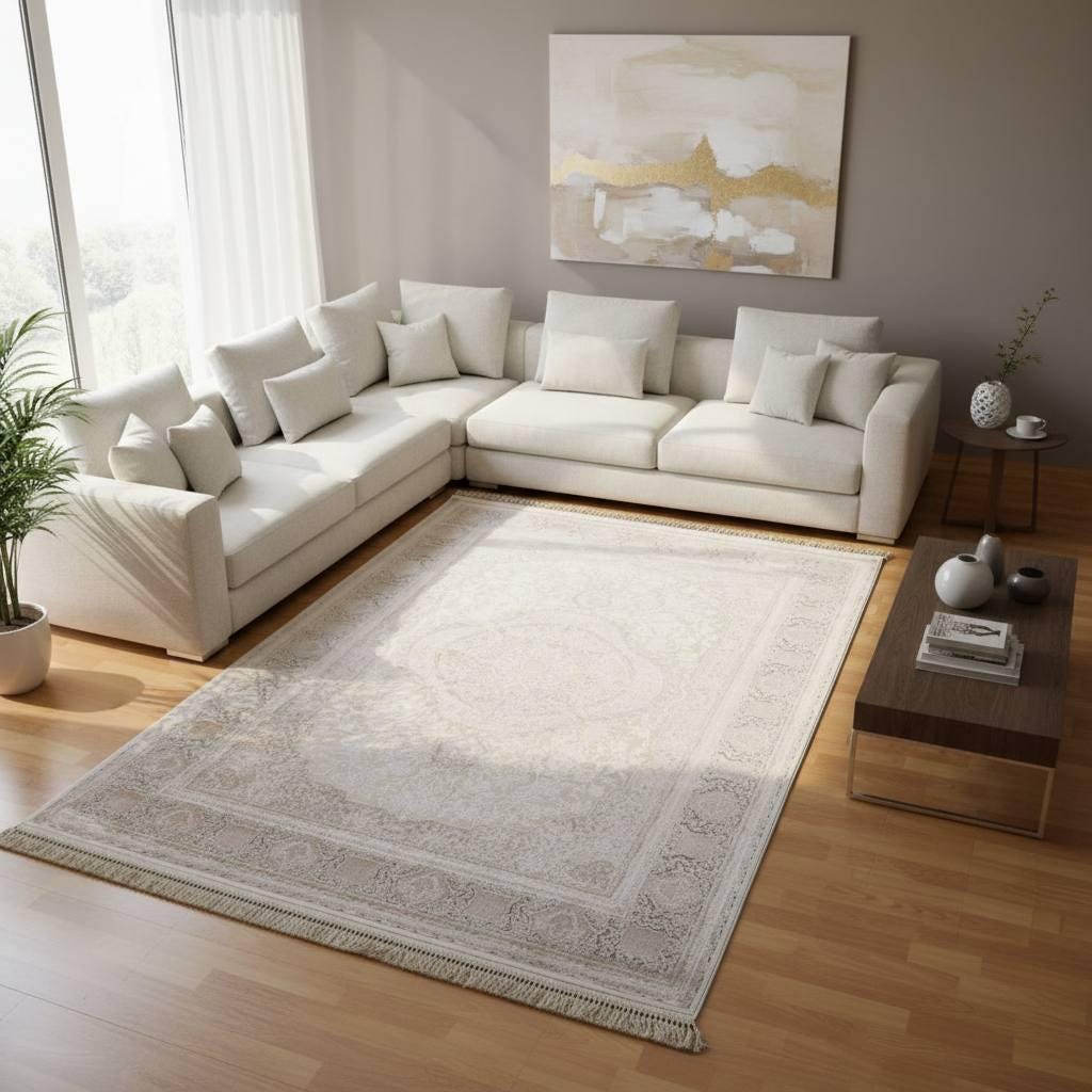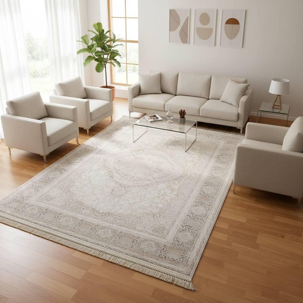 Enhance your home with this elegant beige cream area rug, designed with a subtle medallion pattern and decorative border. Its soft neutral tones create a calm and sophisticated atmosphere, perfect for modern, classic, and minimalist interiors.