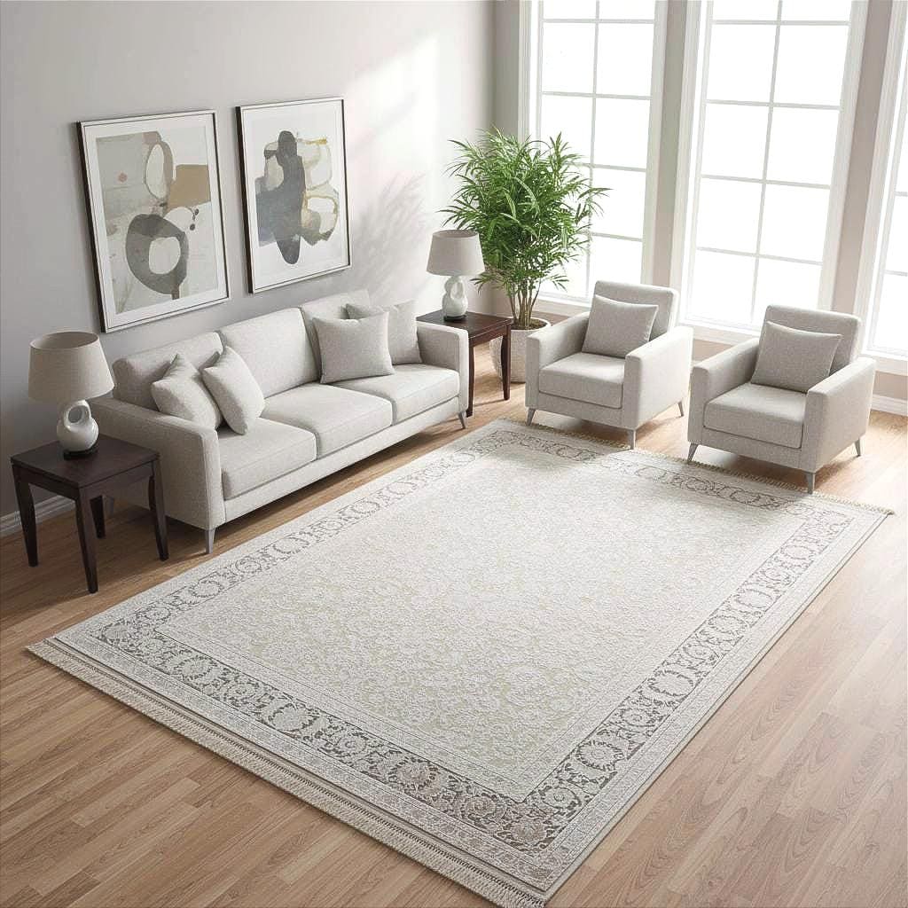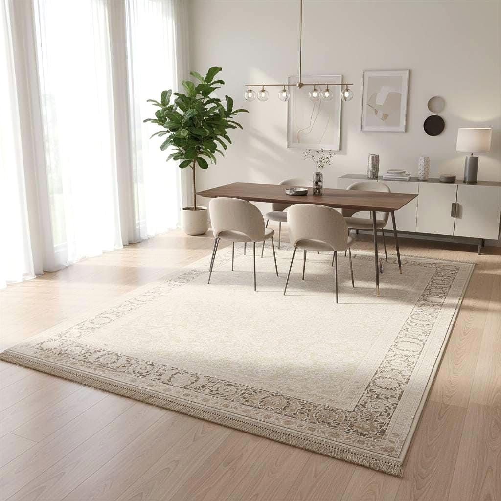 Beige Cream Area Rug 6.6 x 9.8 ft Large Living Room Rug Neutral Border Carpet Acrylic Viscose Rug Modern Classic Home Decor