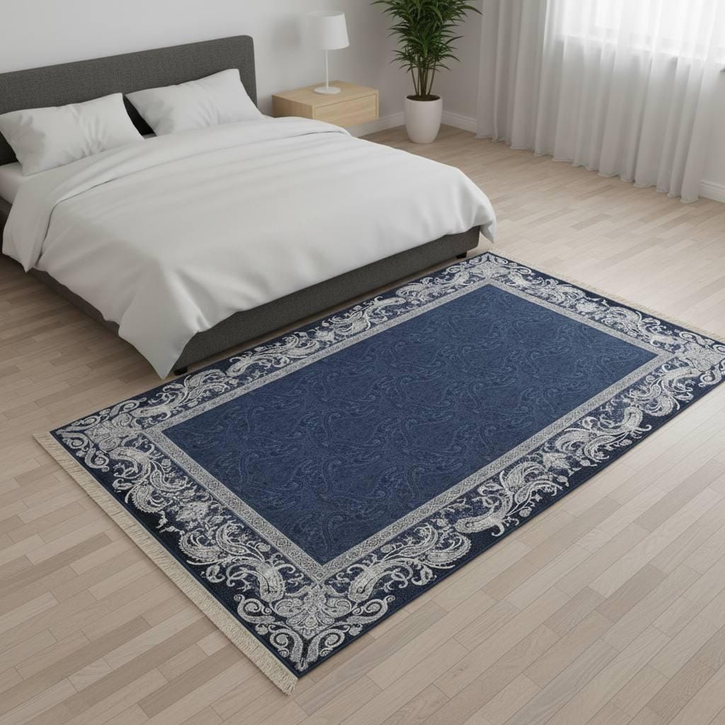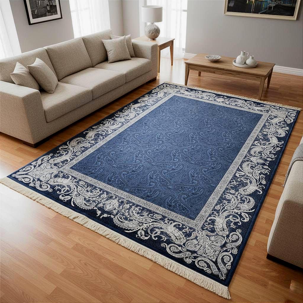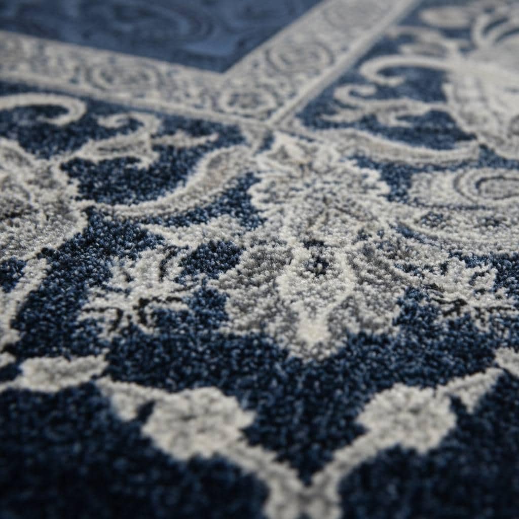 This elegant navy blue area rug features a detailed white floral border design, bringing a timeless and sophisticated look to any space. Its rich color and classic pattern make it perfect for both traditional and modern interiors.