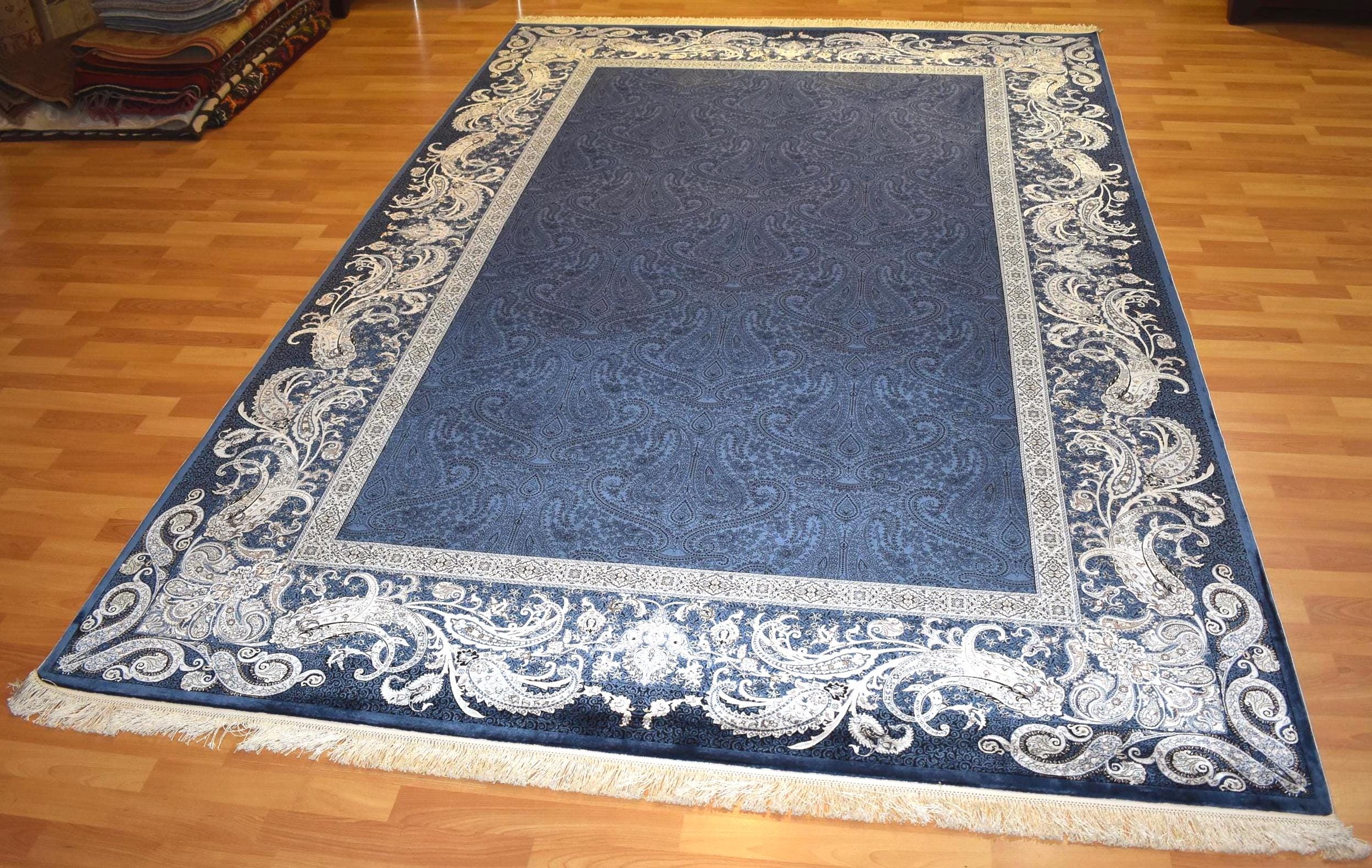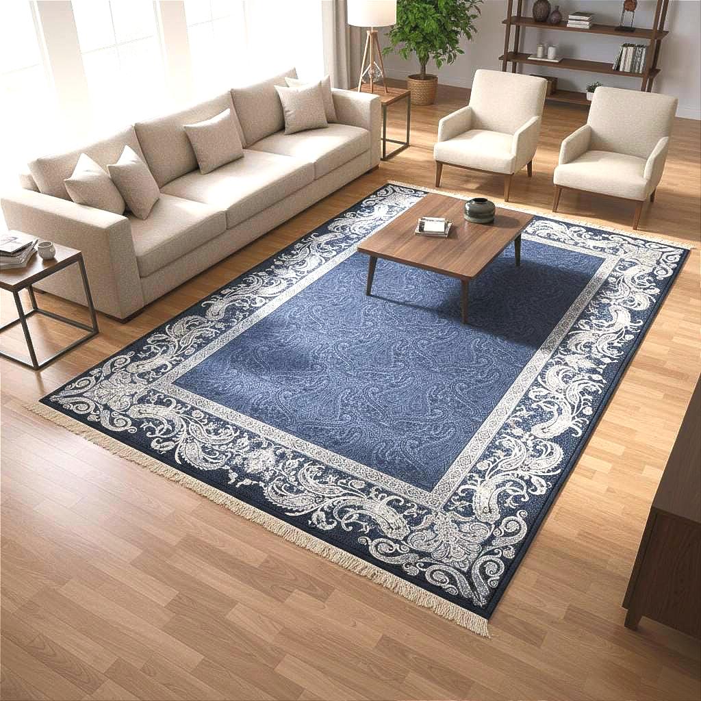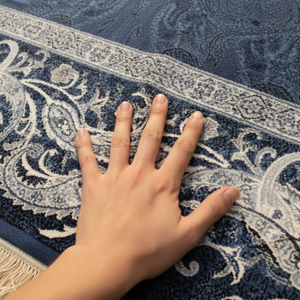 This elegant navy blue area rug features a detailed white floral border design, bringing a timeless and sophisticated look to any space. Its rich color and classic pattern make it perfect for both traditional and modern interiors.